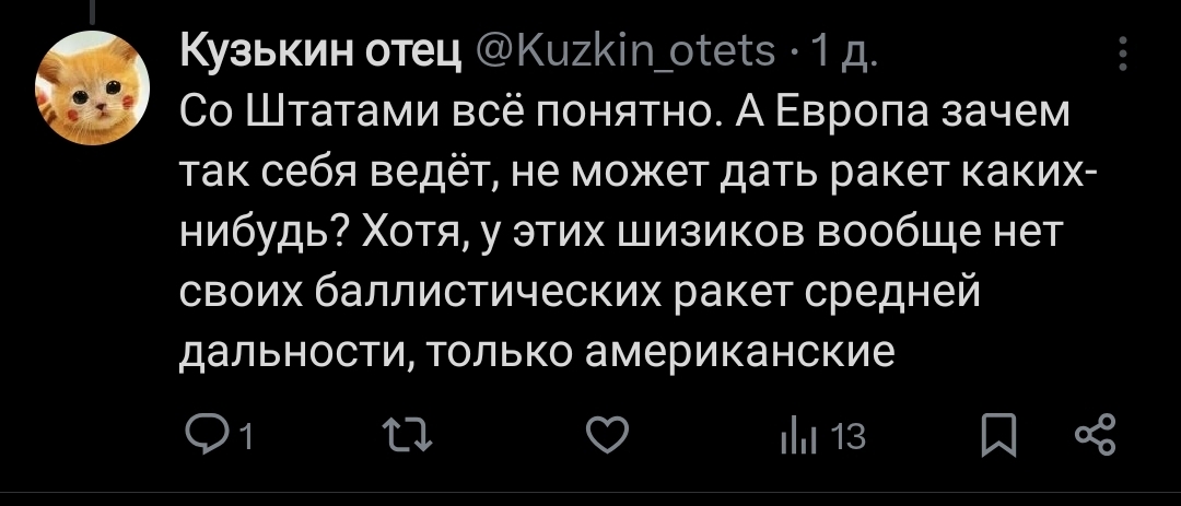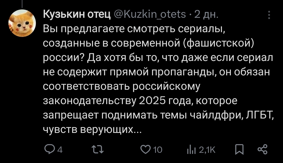 >>1267518 > а просто поехавший местечковый дед, Да заебал ты со своим врёти. Этот дед стопудов бухает с теми русами которые живут здесь давно и он от них узнал как нас называть если мы все приехали такой толпой или чем мы отличаемся от русов прошлой волны. Да, я лично общался с дедом из Москвы который сюда на войну приехал и жена у него хорватка и он с ней познакомился когда в Хорватии воевал в начале 90х. Ты прост бомбишь лишнего кароч. В целом не то чтобы они не имеют права так говорить или называть, но если не хочешь воевать, то значит ты дезертир и похуй вообще. Это ничего плохого не означает.