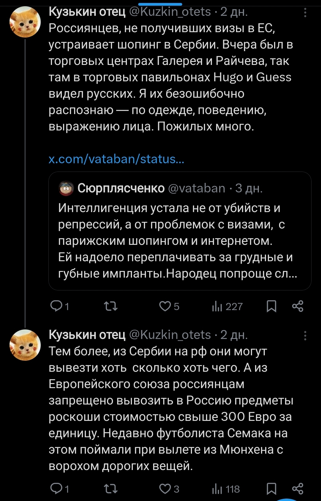 >>1270883 Вучич до мая месяца вроде как сидит, потом начнется то что начнется. Ну свалить можно дохуя куда включая те страны которым будет выгодна толпа русов с минимальным чеком 1000 евро в месяц на жизнь, тупо чтобы циферки в ВВП поднять. А такие законы могут дохуя где нарисовать, хоть в той же Франции или Австрии. Да и не думаю что вместо Вучича кто-нибудь другой откажется от русов ради хуйпойми обещаний вступить в ЕС хоть завтра. Не-вступление выгоднее для местной мафии, для каких-то там корпораций в том числе европейских и это вообще не про завтра, а достаточно длительный процесс который будет постепенно менять правила игры для всех интересантов. Как мы видим даже Черногория которая в принципе Сербия не особо хочет в ЕС, но ее устраивает дырявость границ и трафик наркоты. Ну и русы там дают что-то в виде денег даже зимой, а без русов это будет безлюдная хуета из которой даже голодные албанцы сбежали. В общем вопрос не почему остались, а почему ничего не происходит - и этот вопрос не по адресу.
