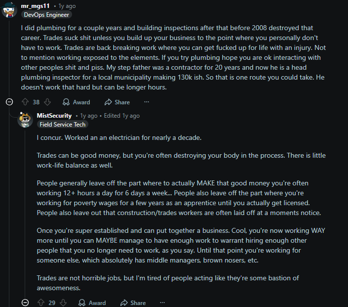 >>1276716 > plumbing > electrician > back breaking work > destroying your body Ну да, ну да. Но айтишники с ручками-веточками в такое может и поверят. Кто хотя бы дома делал ремонт только поржут.