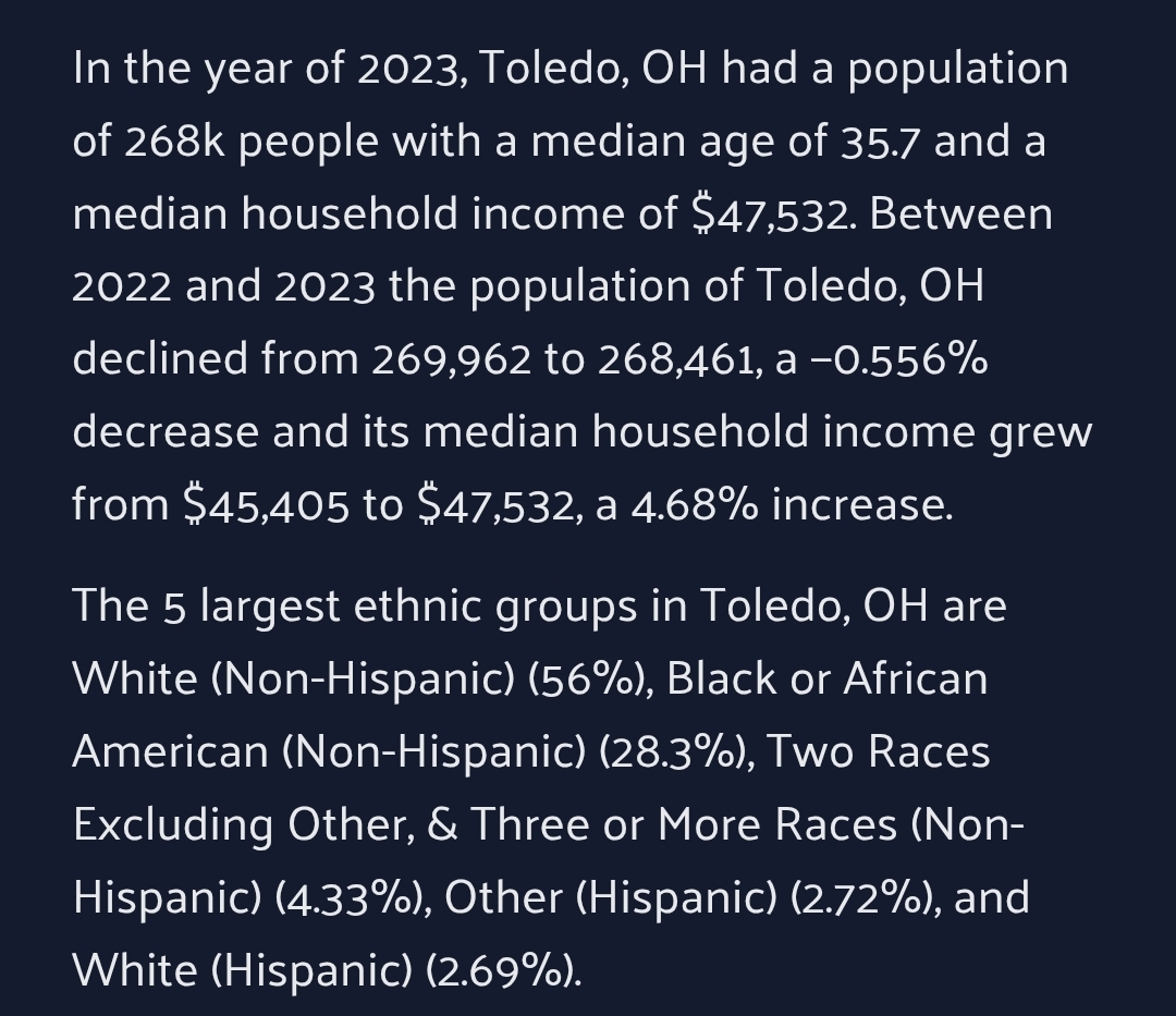 >>1283166 я не форшу ничего. Мне ютуб ежедневно кидает видео от риэлторов в разных местах, и дает тем самым представление о ценах. Жить в США намного выгодней, чем даже в Европе, а про Москву вообще молчу. В Москве цена на омерзительный картонный скотоблок в дистопическом пейзаже и 2/10 климате - такая же, как за целый дом (пусть и тоже картонный, но соседей-то по бокам и снизу-сверху нет, отчего и шума тоже нет) не то что в Огайо, а даже и в куда более приятных локациях.