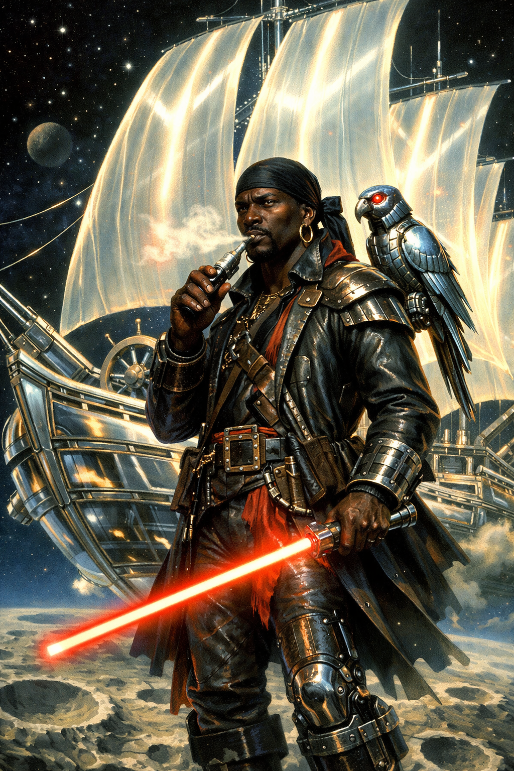 Кибер-пират — капитан летающего хромированного корабля с парусами света. Он летает над лунными кратерами и грабит древние орбитальные маршруты, добывая энерго-ядра, из которых делают световые паруса. Для него это не просто добыча — это свобода: пока есть ядра, корабль не принадлежит ни одной империи.