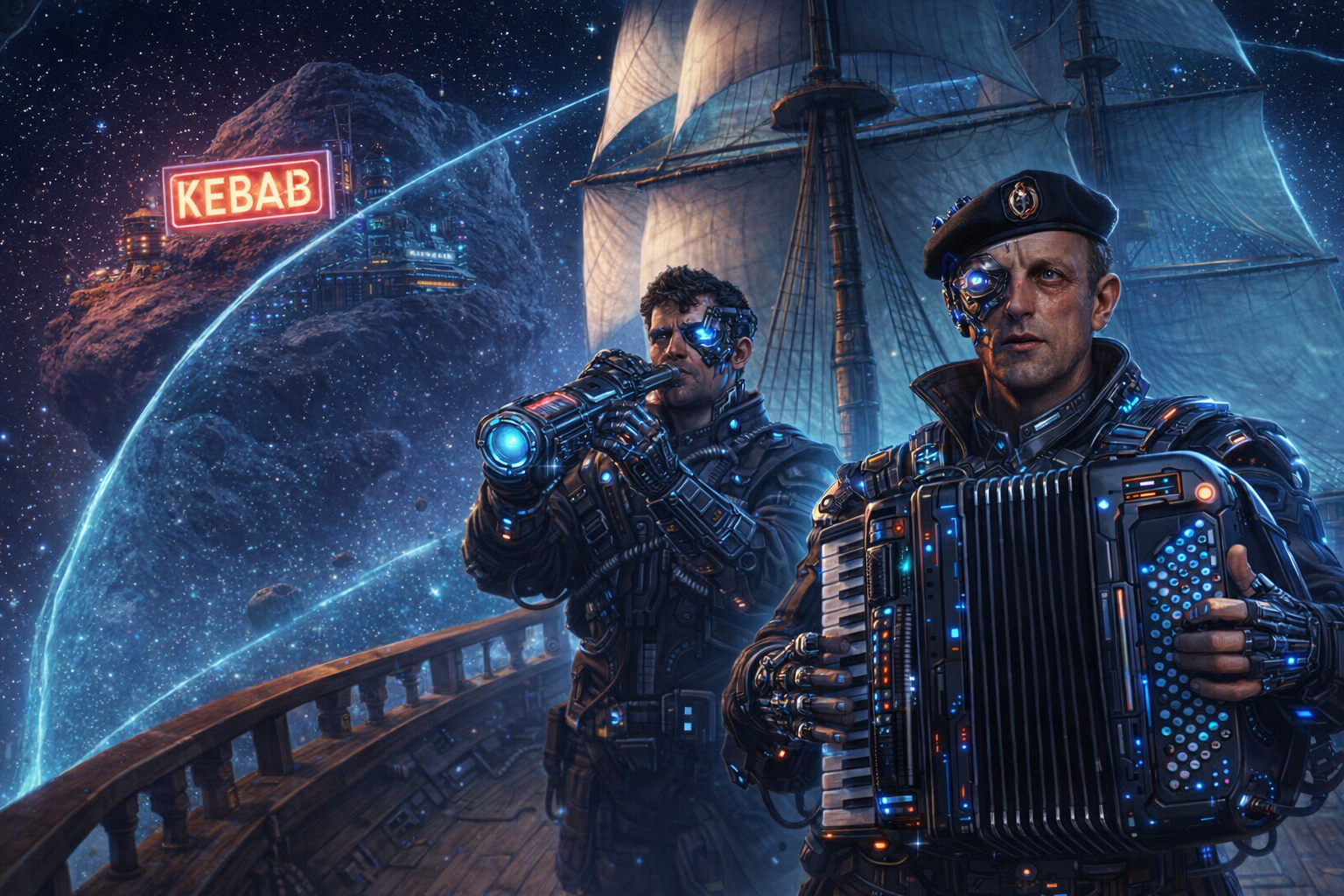 Лунный свет скользил по хромированной палубе, когда кибер-пират затянулся вейп-трубкой и посмотрел вниз — на кратеры, похожие на старые шрамы. Робот-попугай щёлкнул сервоприводами.