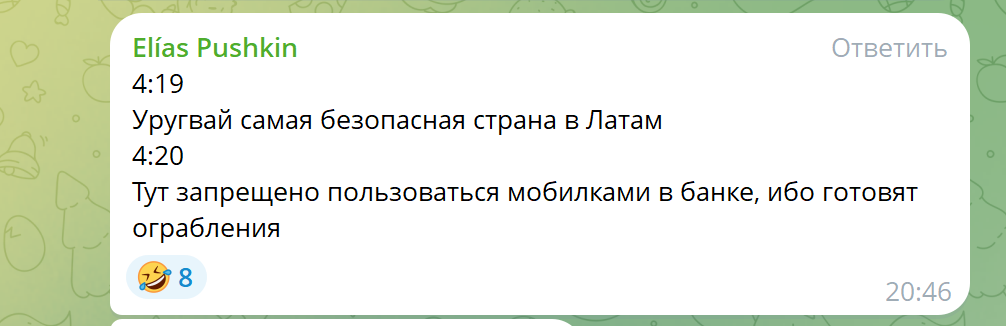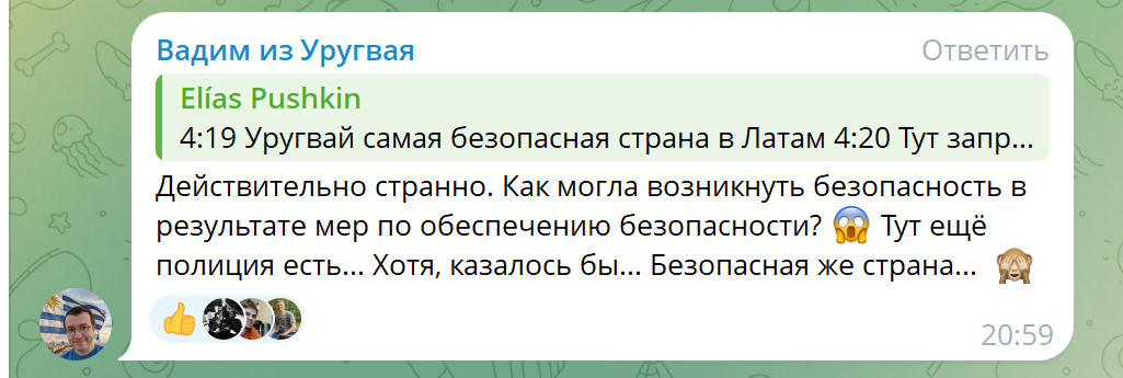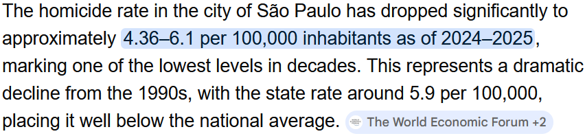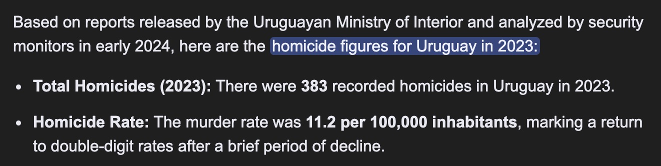 Так в столице (Монтевидео) еще хуже, чем в среднем по палате. Там уровень убийств 14-16. Это почти в четыре раза выше, чем в Сан-Паулу, который в общественном сознании считается мегаопасным городом с фавеллами. Правда данные еще до ковида, но вряд ли что-то изменилось, скорее стало еще хуже, так как в среднем по Уругваю уровень убийств с тех пор вырос.