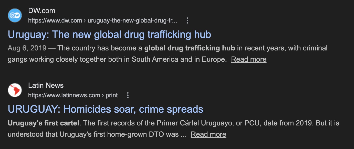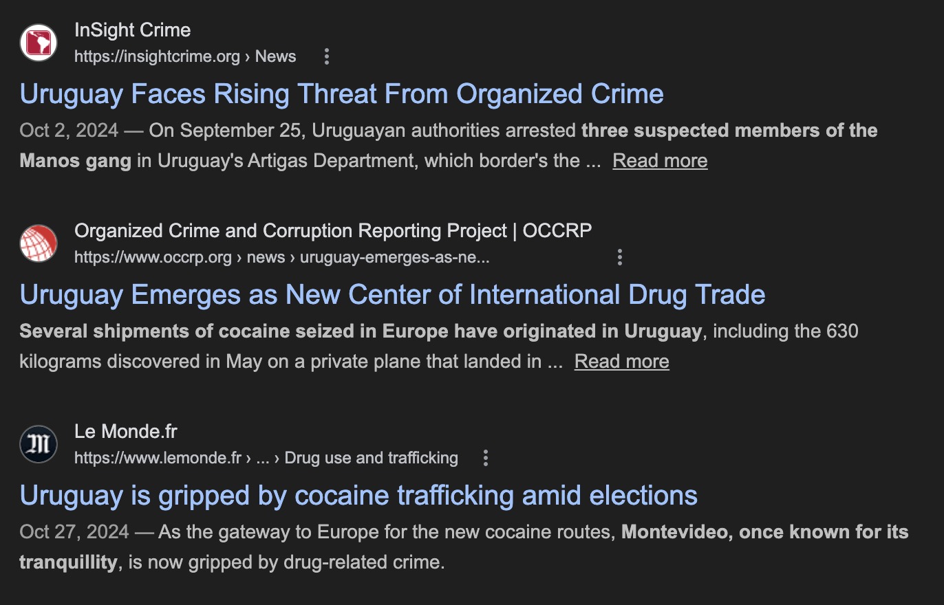 >>1281984 >Так в столице (Монтевидео) еще хуже, чем в среднем по палате естественно. Потому что там крупнейший порт и самые удобные возможности для ввоза наркоты.