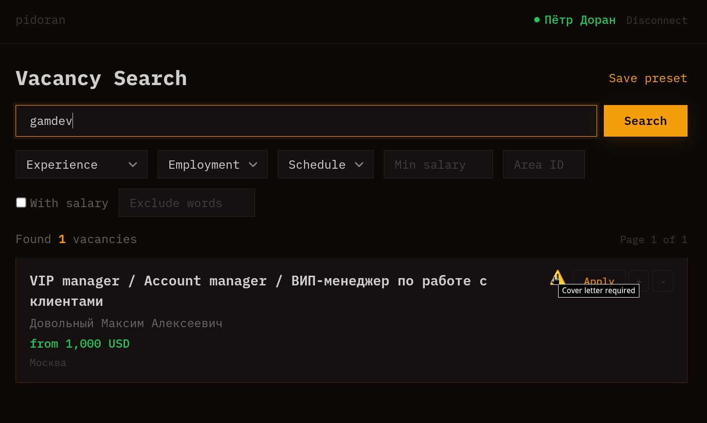 Чисто ради спортивного интереса завайбкодил фронтенд ХХ.ру для П.И. Дорана, с автооткликами, ии генерация на сопроводительные письма, понимает где сраная вакансия содержит обязательное сопроводительное или тестик ебучий и генерит им ИИ слоп, и сидеть в чатиках общаться с РАБотодателем на хх ру и куча других фич.