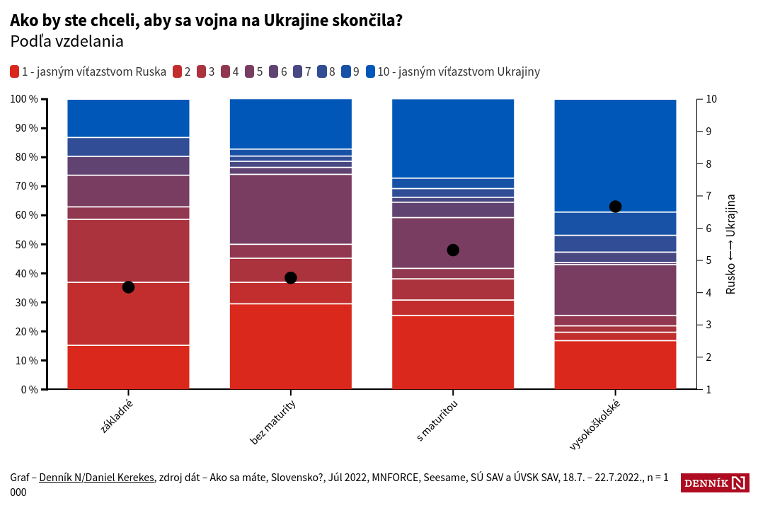 Словакам задали такой вопрос: Как вы бы хотели чтобы война в Украине закончилась? Среди ответов были: Однозначной победой России (Красный цвет) или однозначной победой Украины (Синий цвет на графике), ну и небольшие градации. Результаты можете наблюдать на скринах.