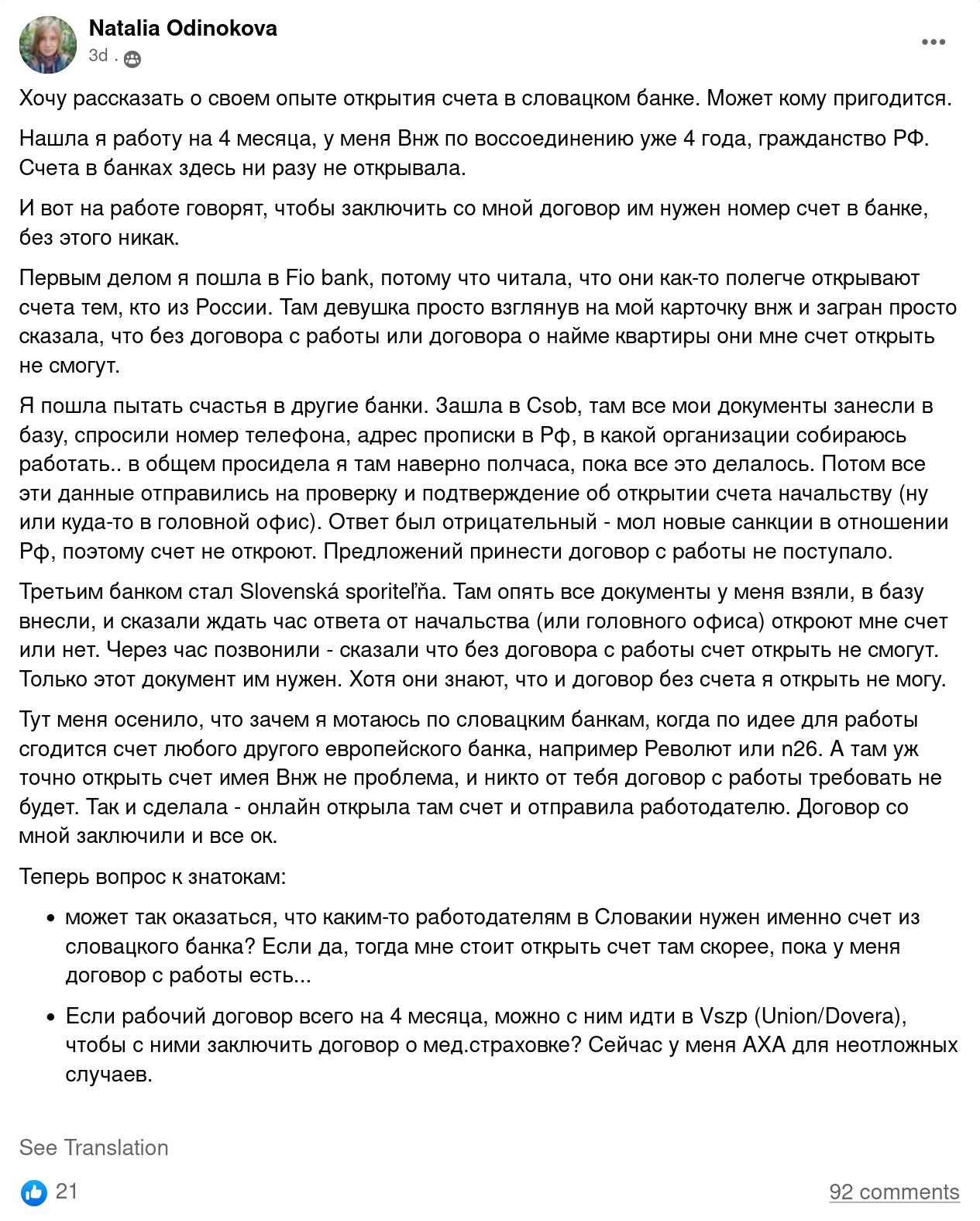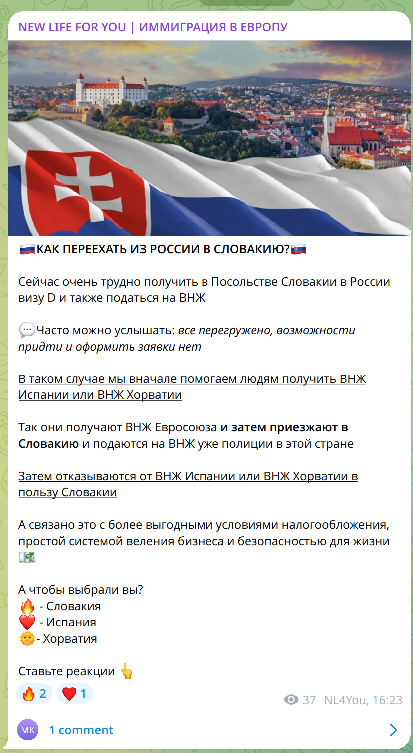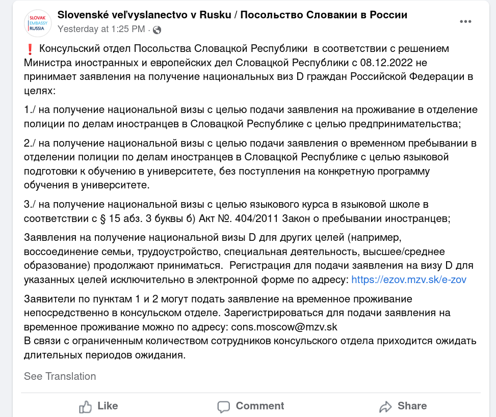 На сегодняшний день ситуация осложняется 1) Ковидошизой 2) Беженцами с Украины 3) Закрытием воздушного пространства для российских самолетов. 4) Отказом некоторых словацких банков открывать счета для россиян