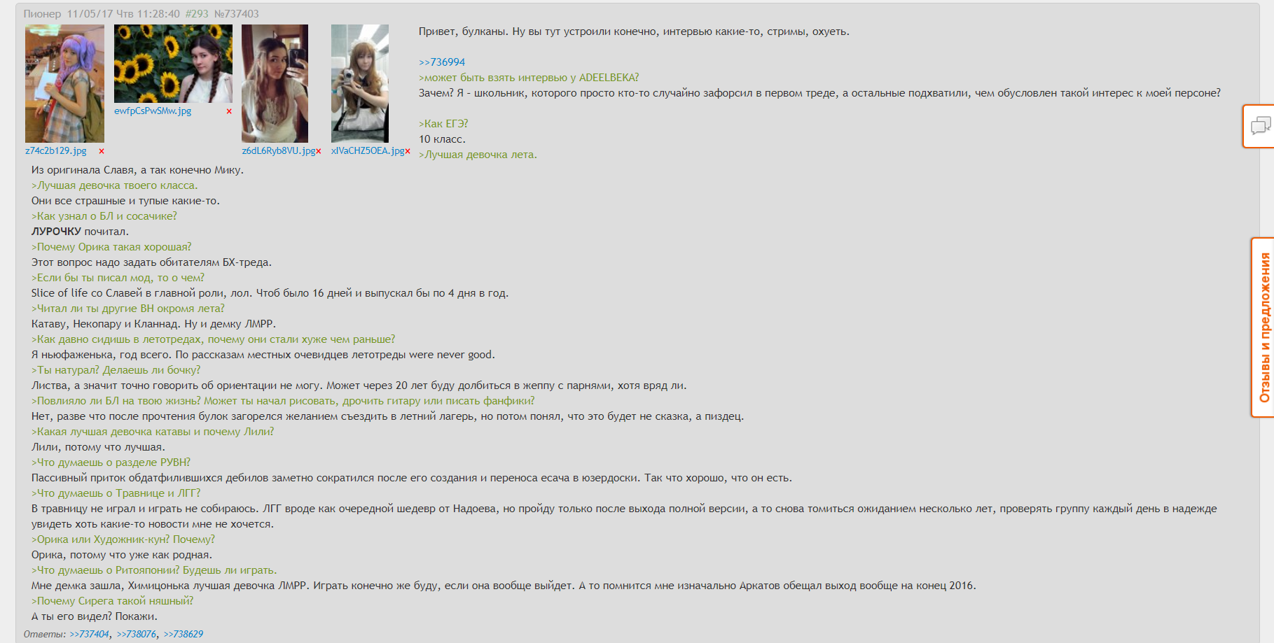 >Молодец, что заходишь. Кстати, а из ВН вообще что-то читал, кроме тех дежурных "клоунад, какава))"? Спасибо. Из ВН больше нихуя не читал. Как и из манги, ранобэ. Даже книжки не читаю, сериалы-фильмы не смотрю. Тяжело стало в последние годы заставить себя усидеть на месте и просто наворачивать контент без взаимодействия. Да и я бы не посягнул на прочтение других новелл пока не прочёл родные булошки до конца, это же почти равноценно измене. Даже расхайпленный литературный клуб, и тот не прочитал.