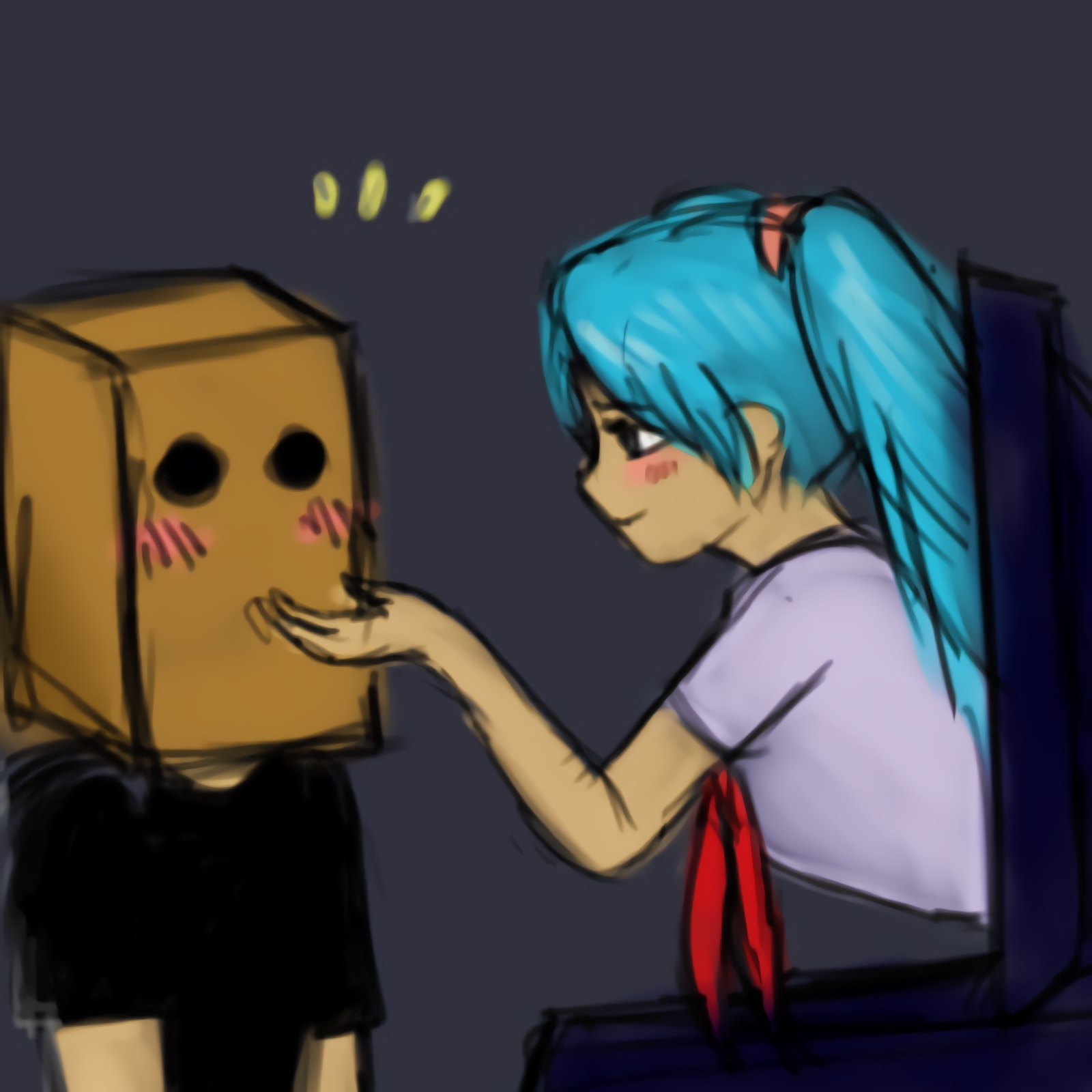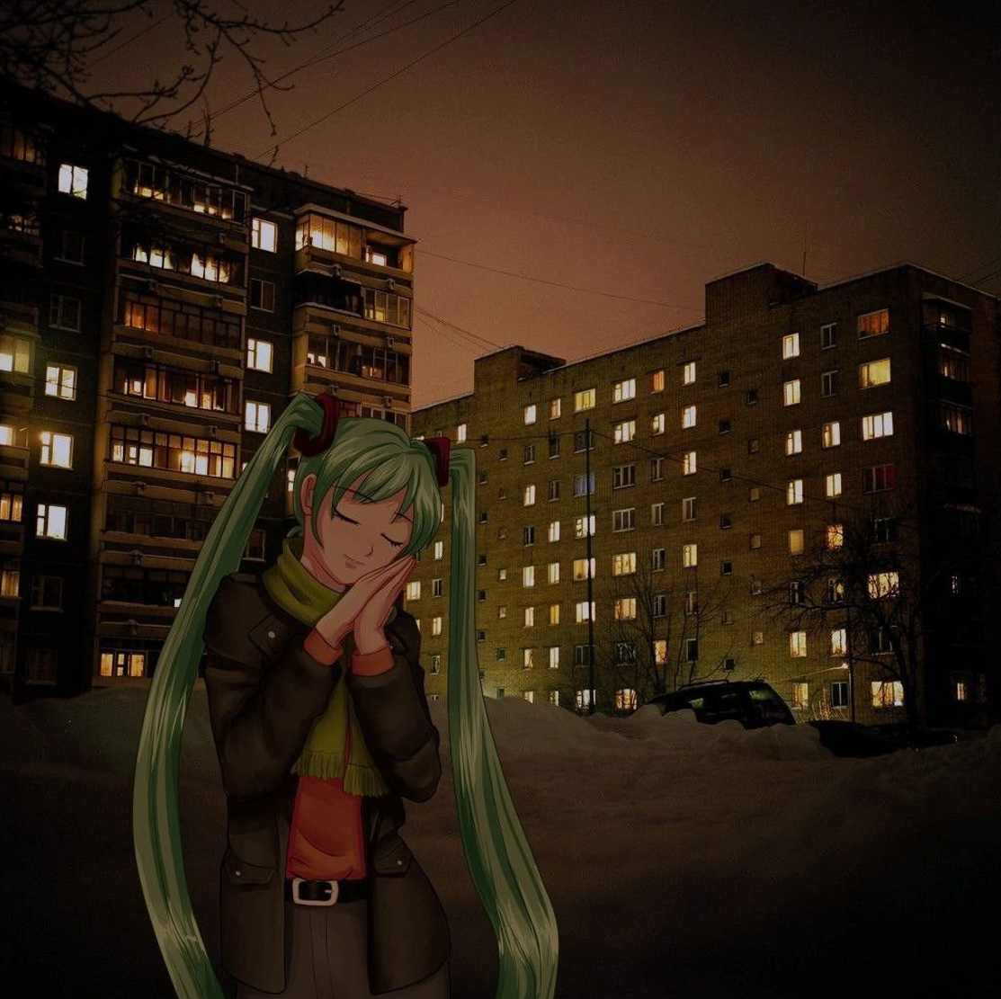 Там показана мечта датфилина - 10из10 тянощька (не обязательно Мику, можно и Славю, но с Мику контраст резче всего), прильнувшая к помойному баку с его родной помойки у дома и признающаяся ему в любови до гроба.