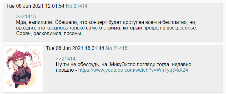 >>1100003 https://magicalmirai.com/2021/osaka_overview_en.html#osaka_ticket_live Правда иностранцам его вроде как просто так не взять. >>1100012 Наверное обычное чувство собственничества. >>1100018 Тред не стагнирует и не гниет. Тред ожидает своего героя. Годами так было, если нечего обсудить - все молчат, лишь иногда разбавляя тишину редкими артами. А податься микунам некуда особо, все микутреды либо возвращаются к такому же состоянию, либо превращаются в чатики только для своих, где обсуждают вообще не Мику. В /aa/ треде постят только артики, на музаче я последний раз видел тред в 2016 году еще, на соваче тред уснул. Да и зачем прям куда то уходить? Очевидно что контента нет не потому что тред такой, а потому что среди нас нет творческих анонов. И в другом месте ничего не изменится. Но если знаешь места интересные, то ты пожалуйста приноси ссылки, схожу, посмотрю.