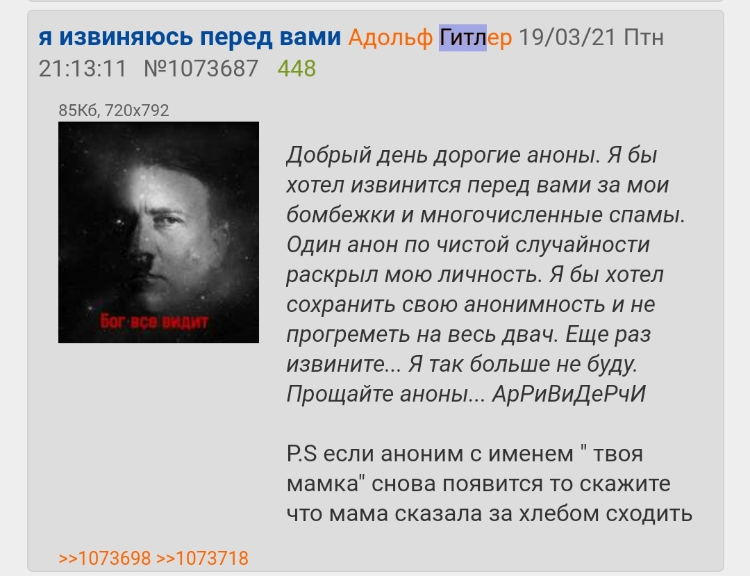 Господа миканы, у меня плохие новости. Есть вероятность, что сегодня вечером на Мику-тред снова будет совершен налет Адольфом Гитлером. Вероятность не стопроцентная, потому надеюсь, что ничего такого не будет, но советую держать ухо в остро.
