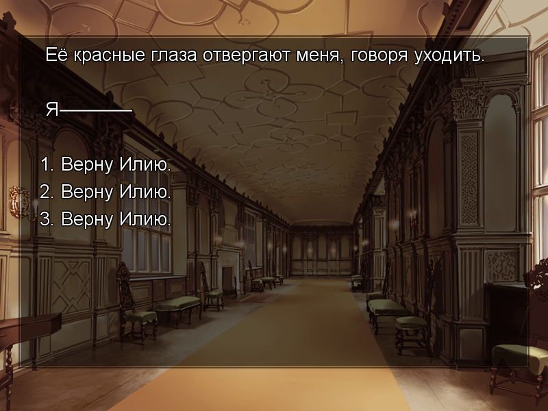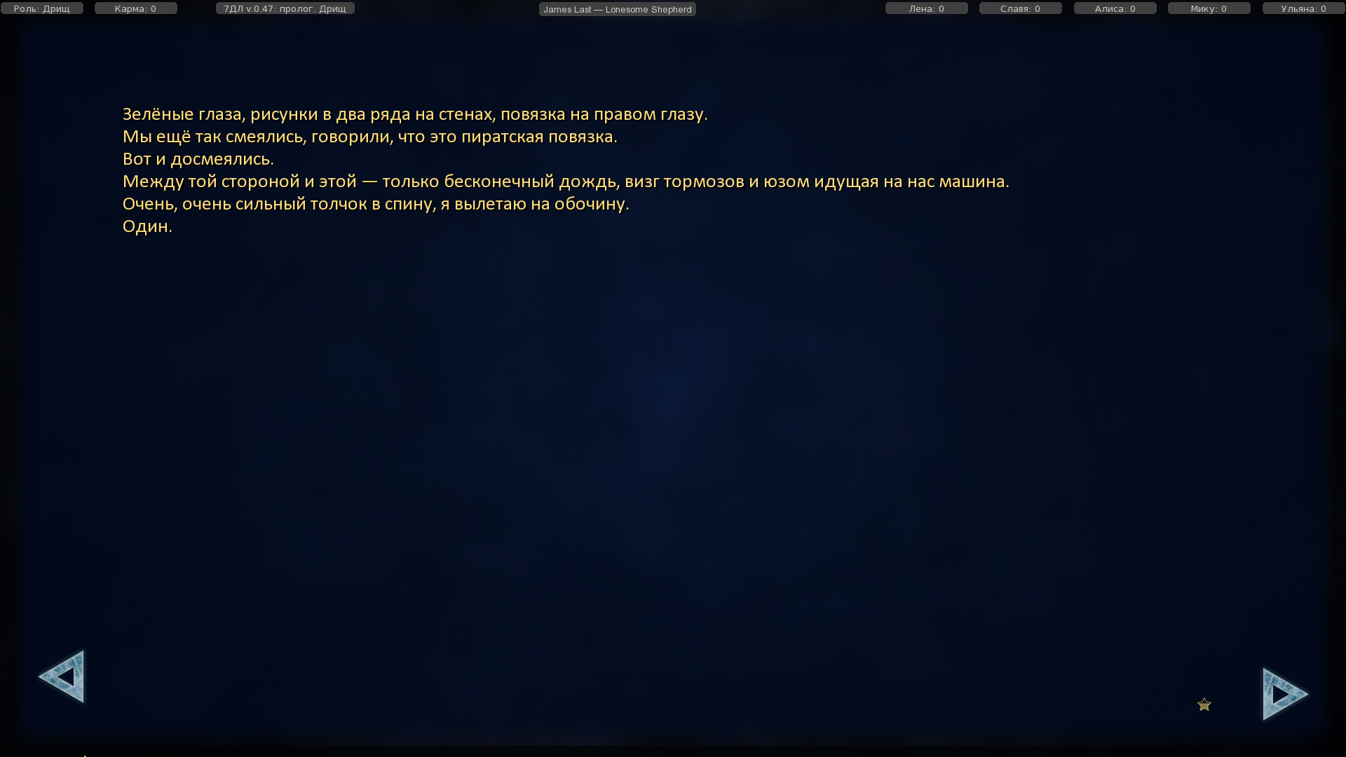 >>1095015 "У меня всегда хорошо получалось шевелить мышкой, но не очень — шевелить мозгами." "Особенно в общении с людьми." "Потому простреливать головы из рейлгана всегда получалось как-то лучше, чем доносить в головы собственные мысли." "Потому я и отказался от затеи кому-то что-то донести." "Шевелил себе мышкой и имел с этого небольшую копеечку." "А потом влюбился, и…" "Я никогда не думал, что история рывка в неизвестность закончится вот так:" voice "Тебе не двадцать лет. {w}Что мне надо будет отвечать дочери, когда она спрашивает, кем работает её папа? В игрушки играет?" "Играет." with fade "Видимо, тогда всё и покатилось под откос." "У меня есть некоторое образование, хотя, конечно, не чета моей ненаглядной." "Я неплохо умею делать мебель." "Вот только её изготовление требуют совсем других навыков, а не молниеносной реакции и точности с контролем." "Пришлось выбирать — или дело всей жизни, или…" "Деньги." "Которых у меня на тот момент было мало." "Так что вместо тренировки к отборочным я отправился на собеседование." "И вышел на работу." "Здесь всё началось." stop music fadeout 5 with fade play music music_7dl["wonderful_faraway"] fadein 3 "Первая ласточка началась во время беременности." "Проголливудченный насквозь мальчик ждал, что всё будет как в фильмах: девушка сообщает, что скоро их станет больше, муж захлёбывается от счастья, подхватывает на руки и кружит её по комнате." "Это же логично, правда? {w}Люди имеют право на счастье, право знать, что всё будет хорошо." "Мальчик так долго ждал этот момент, так предвкушал…" "Чтобы однажды утром, проснувшись, открыть блог супруги и прочитать там какую-то гадость." "И только таким, максимально извращённым способом узнать, что стал отцом." "Не мог спросить? Не мог.{w} Хотел." "Но, уставший, бежал с работы, остановившись лишь у ларька, чтобы купить бесценной своей её любимую шоколадку." "Уснул в душе, а оттуда перебрался уже только когда в двери забарабанили." "Плохой я, плохой." with fade "Впрочем, после предложения руки и сердца через смс это даже ожидаемо." "Я никак не мог набраться смелости, чтобы спросить вслух, потому и отправил сообщение." "Дурак, конечно." "Но тенденция складывается… если однажды станет совсем кисло — она и разведётся со мной через вайбер или скайп." "По-детски." "Так что не был я ребёнком, и взрослым тоже не стал." "Отняли у меня это право." with fade "И то и дело попрекают этим." "Мол, ты не мужик, не глава семьи." "Именно так." "Я тридцатилетний мальчик, который не сумел найти своего Тайлера и вовремя получить по морде." "А мне хочется просто лечь и всё забыть." "Просто отключиться и больше никогда не приходить в себя." with fade "Чтобы не было больше никогда ни хрущёвки этой, не безысходности, которой сопровождалось каждое пробуждение." "Не было никогда мелкой, спящей у меня на груди." "Не было никогда…" with fade "В моём возрасте очень просто сдать позиции, если перестать тренироваться." "Уж я-то это знаю." "Так что когда на одном из матчей я внезапно оказался в середине доски почёта, не удивился даже." "Я работал, а не шёл к мечте." "Ведь за мечту деньги не платят." scene bg int_excalator_7dl with dissolve "В кармане зажужжал телефон, я включил экран." "«На следующую неделю ничего не планируй! У нас первенство по СНГ на носу, понял? Так что плюй на всё и собирайся в Москву!»" th "Плюй на всё…" th "Да как?" scene bg int_excalator_7dl with dissolve th "Дома четыре бабы — в гости заглянула мама и сестра моей благоверной." th "И я вот так уйду?" t