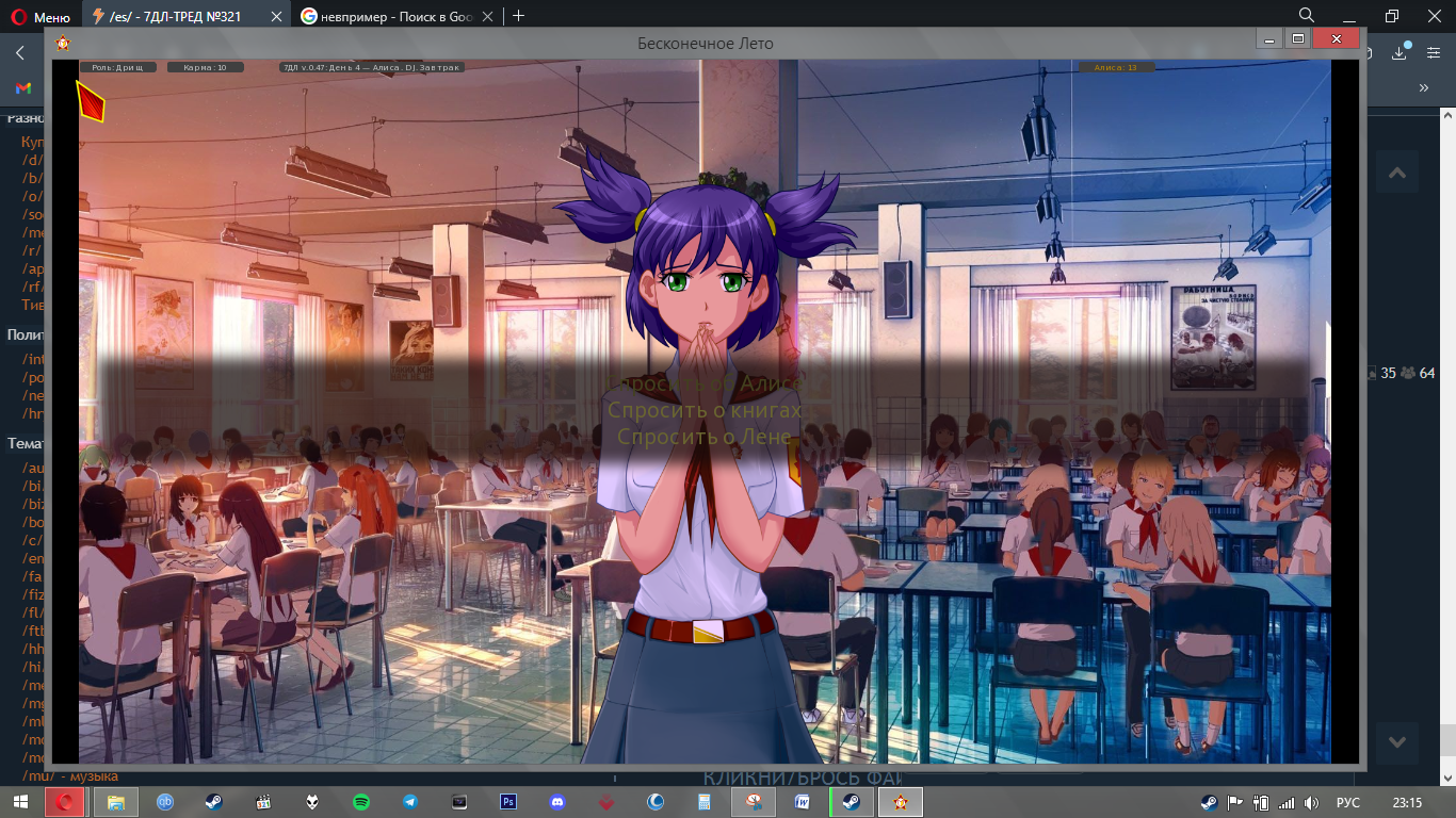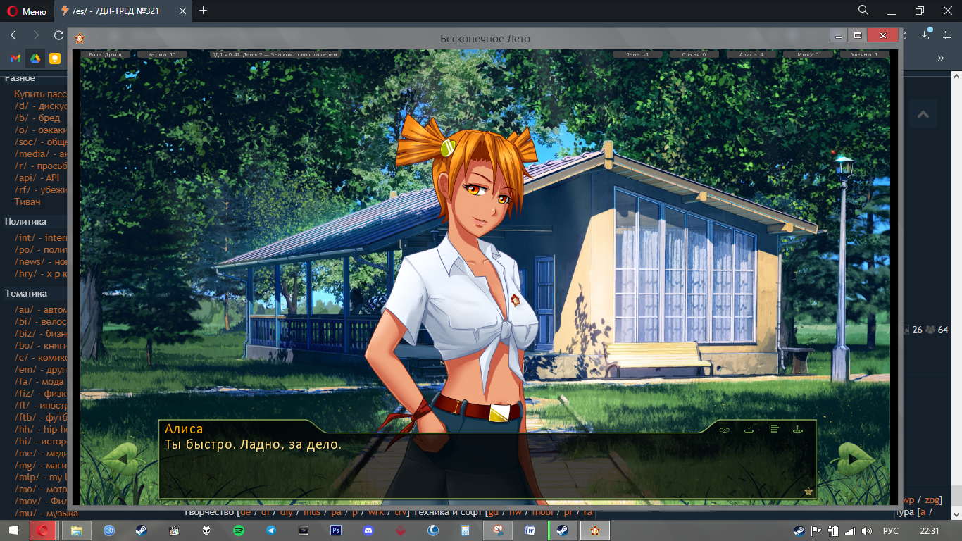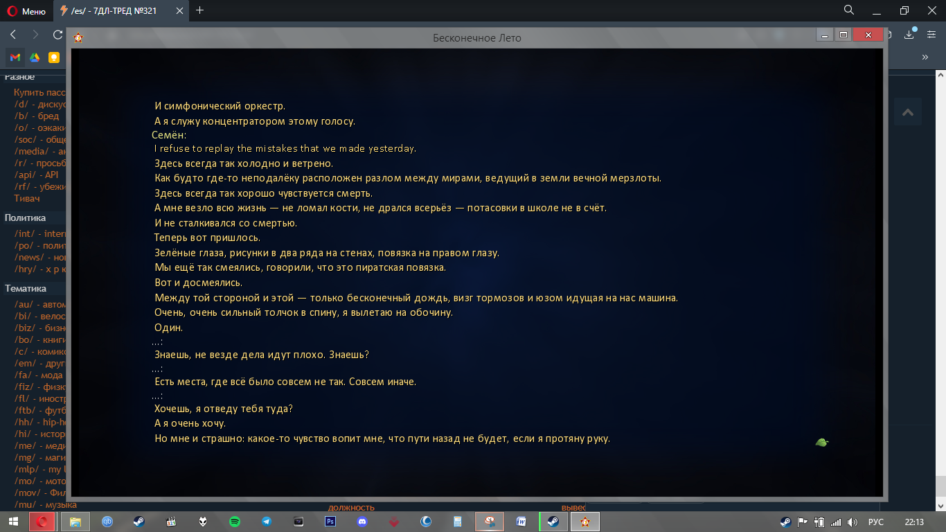 Врываюсь в мёртвый тред с озарением. В 4 дне Лены-фз и в нейтрал-ветке 6 дня Алисонька играет "Город, которого нет" Корнелюка и говорит, что это песня, которую она придумала сама. Песня первый раз появилась в Бандитском Петербурге 2000 года. То есть лопата с ПСР-Алисой появилась уже в начале разработки ФЗ. Кать, когда обнова?