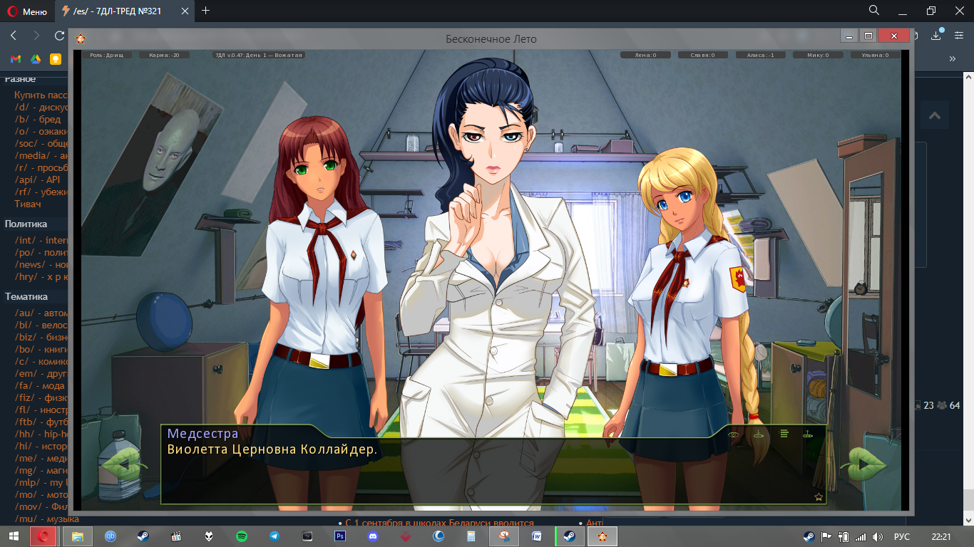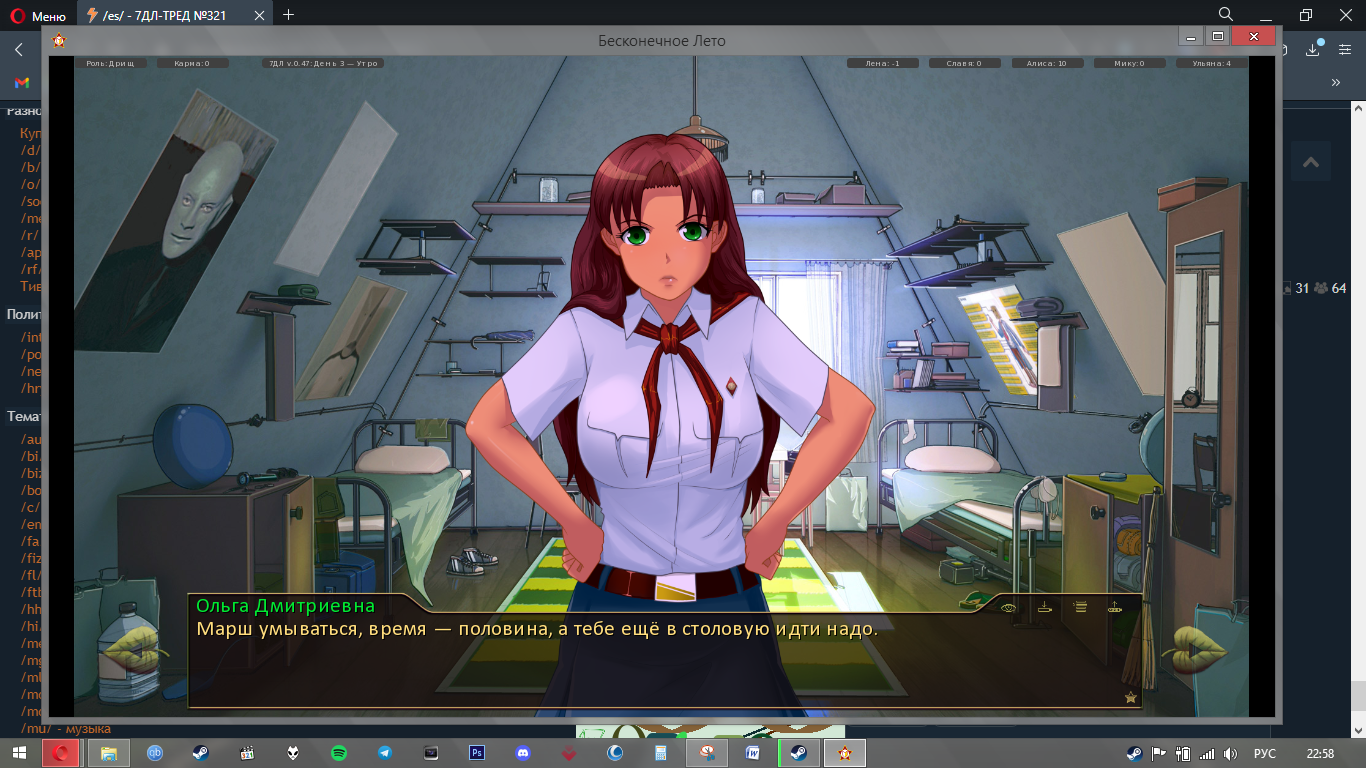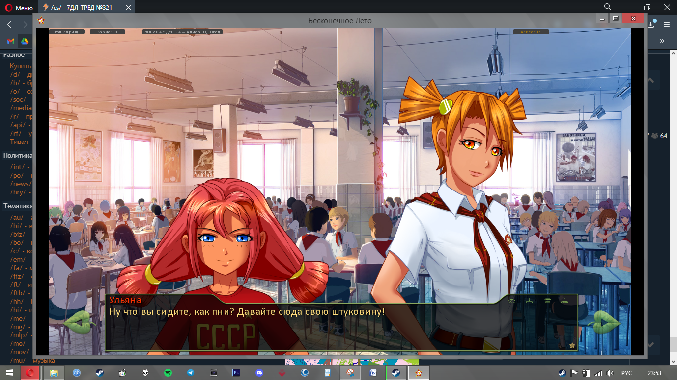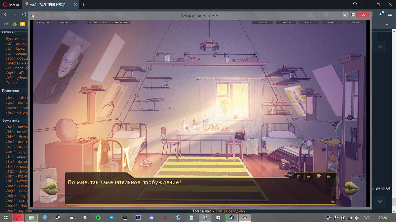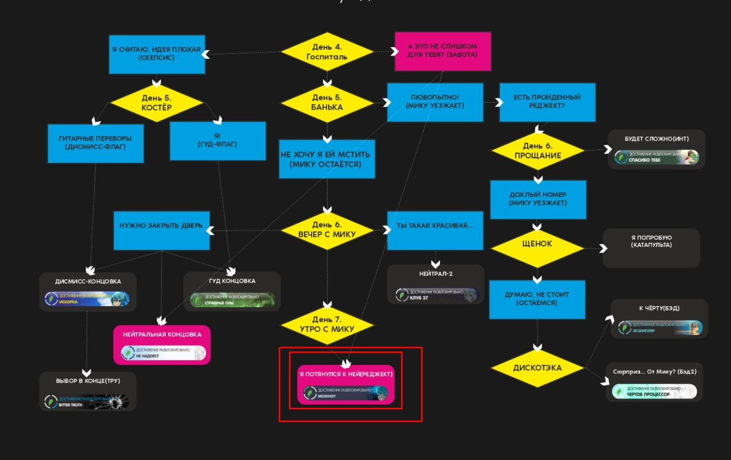 >>1097708 Сычрут(именно 6 и 7 дни) будут переработаны. Сейчас есть 6 день с бэдконцовкой, но это просто считай как заглушка, чтобы игрока не выкидывало в меню просто так. Наибольшее число ответов по устройству вселенной в руте Славя-классик, рутах Ульяны(всё, что про Старую Дорогу) и руте Лена-френдзона.
