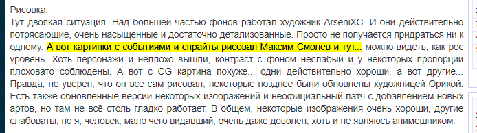 >>1098190 В БЛ и визуальных новеллах я нуб, но за Орику наслышан много, что она нихуя по факту кроме яблока и испорченных CG Смолева не сделала, а мнит себя охуеть какой разработчицей. А ведь ее фиксы реально ужасные. И мне кажется странным, что анонимус позволяет ей борзеть.