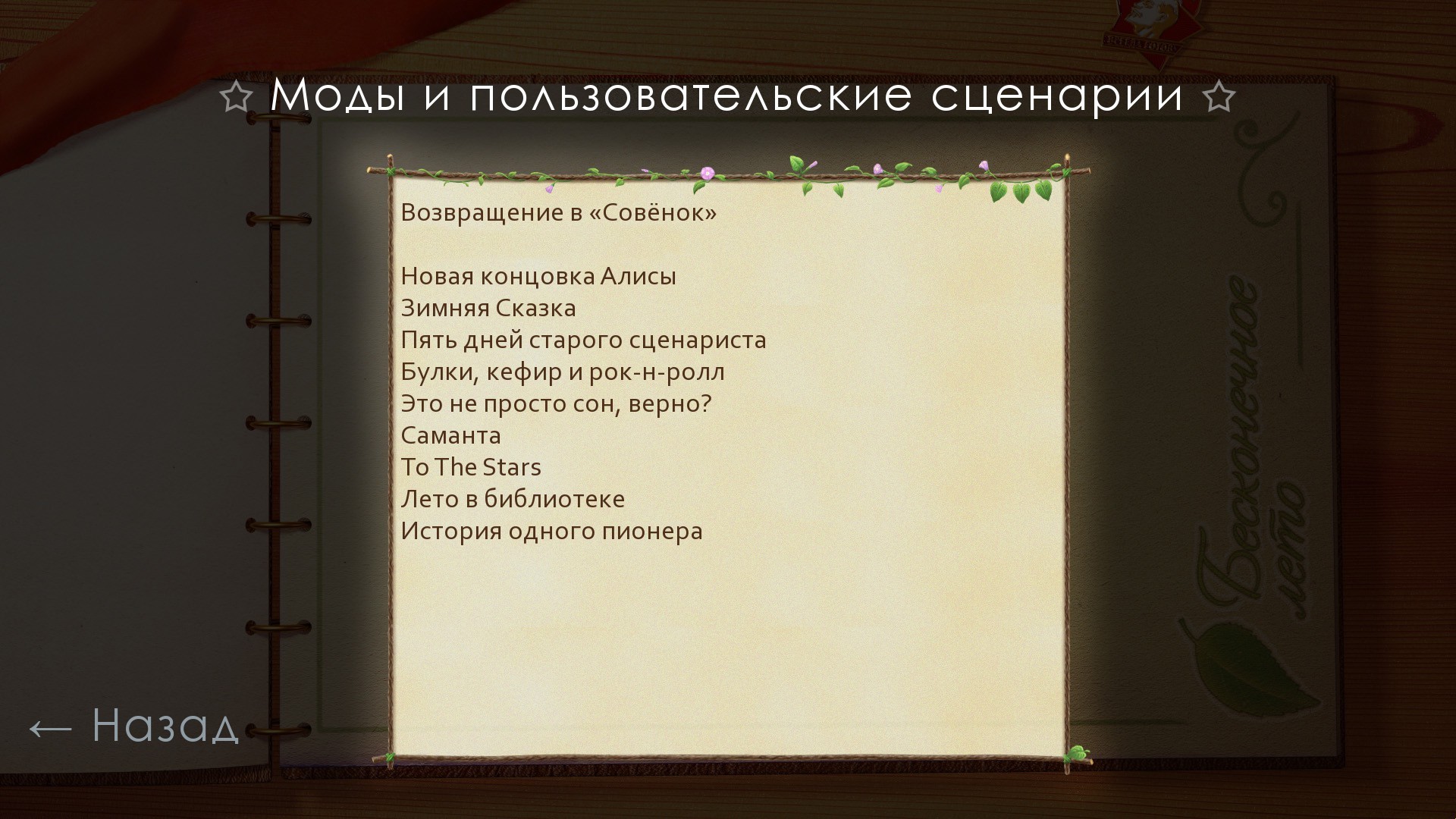 Сап, аноны После прочтения большинства модов про Женю ("Виноваты Звёзды", "Променад", "Я обязательно дождусь", "За тремя горизонтами", классику в лице "Лето с Женей" и "Лето в библиотеке") наткнулся на "Словно глоток свежего воздуха". Пока четыре дня сделано, но авторы обещают разные ветви событий. Мне мод зашёл, первичный образ Жени берут из оригинала, а потом раскрывают её с необычной стороны. Есть кто играл? Зашло?