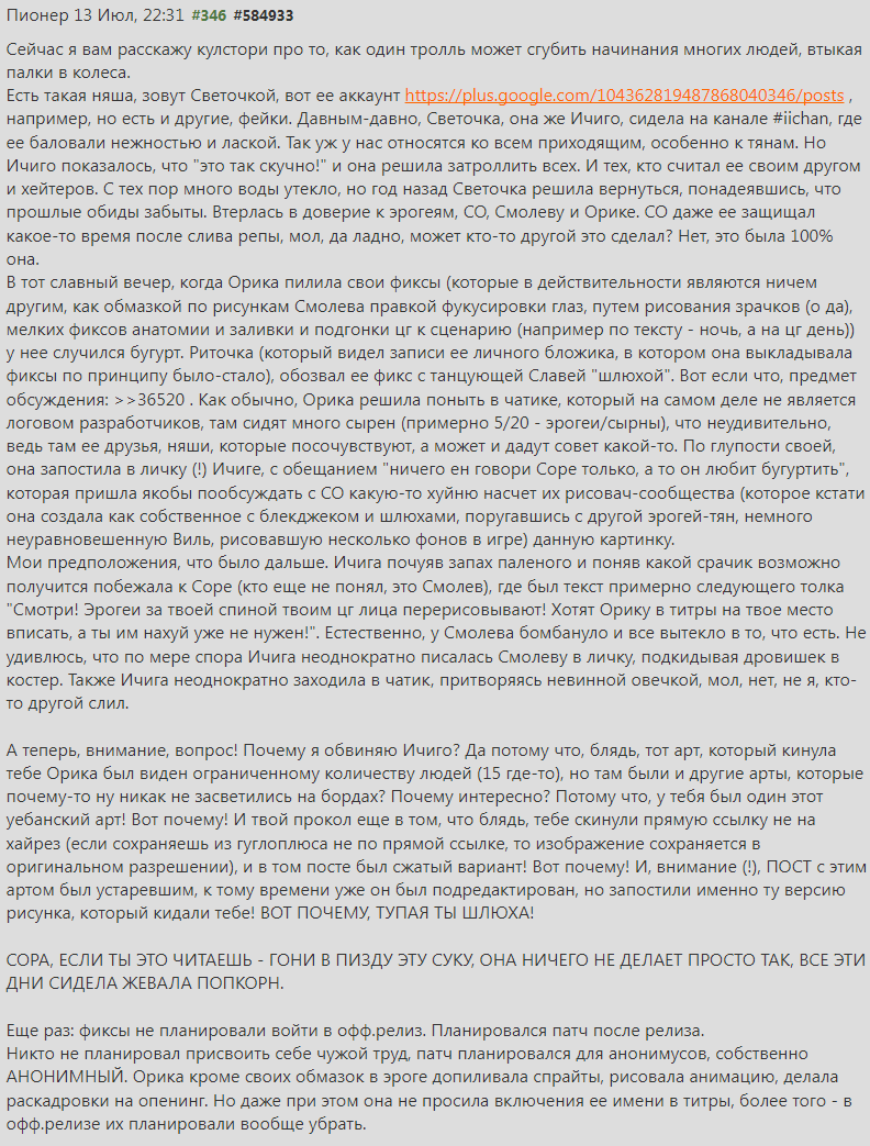 >И речи про кик Смолева не было, были терки именно за фиксы. Были фальсификации за то, что Смолева собираются сместить, а его арты — перерисовать Орикой, когда последняя делала срочные фиксы перед релизом, чтобы оно не совсем хуево стало.