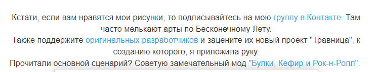 На самом деле и 7дл хороший мод (написан взрослыми людьми, а не школьниками про школьника-нытика хотя иногда и есть ошибки, и истории в целом интересные, и ЛОР гораздо лучше чем мистическое на отъебись в оригинале, и времени и контента ты с любимой вайфу проводишь больше) и БККР (мод для микуфагов про Мику, чего тут удивляться что ГГ изначально ей симпатизирует, а она ему? Этот анон вообще хоть раз общался с женщинами, или он не знает что девушка в первые 5-10 минут общения с тобой определяет отношение к тебе? И арты с музыкой там во многом специфичные, но в целом ок, так как в отличии от агнста пива тут лампота, ваниль и можно отдохнуть от драмы в волшебном лагере с волшебными историями), и Саманта тоже хорошая (проходил давным давно, но в целом помню что нормальный мод).