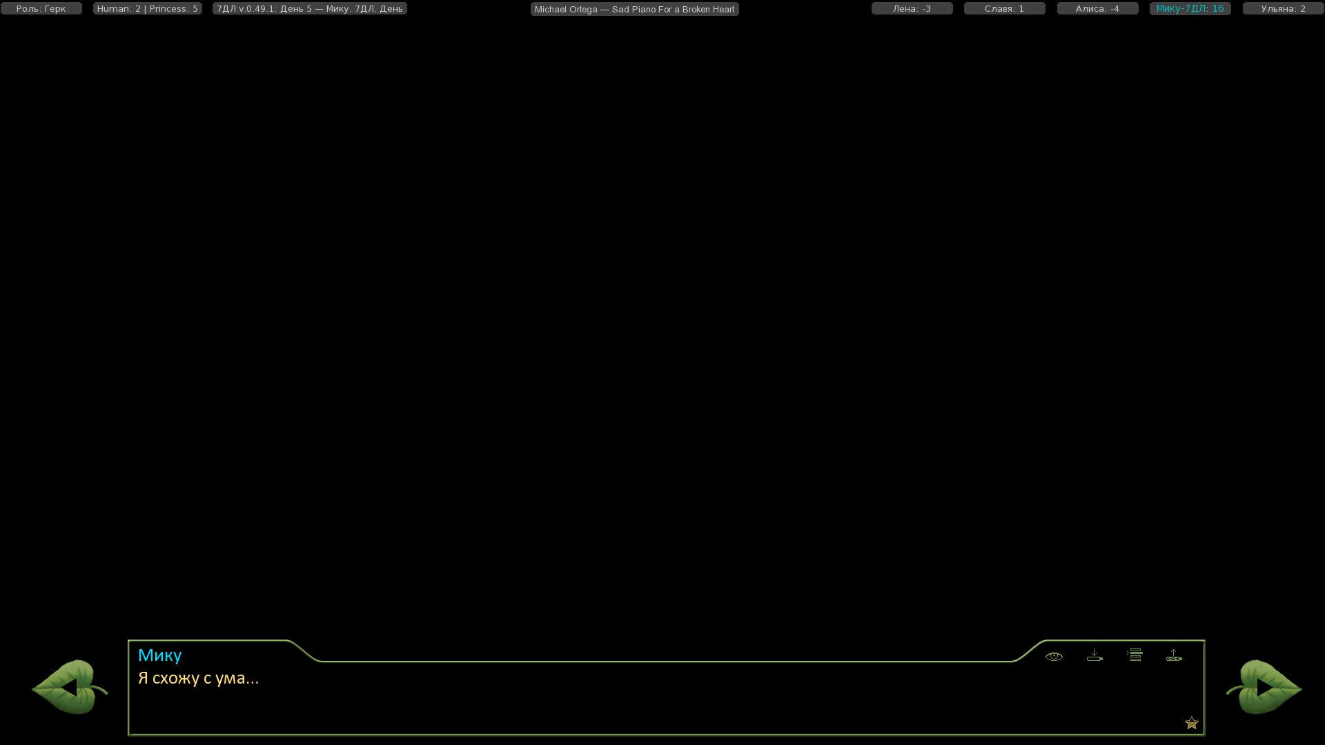 "Когда тебе мало лет, жизнь напоминает уютную картину, одну из тех, что висят на стене бабушкиной спальни." "Незамысловатый пейзаж с домиком в окружении буйства зелени, где всегда будет солнце и лето." "Где всегда будут рамки, за границами которых ничего не существует, а внутри всё навечно останется неизменным, привычным и правильным." "Только вот детство проходит, рамки стираются, картина разрастается и начинает неумолимо меняться." "И лето обязательно сменяется осенью." "Что-то изменилось ещё до того, как автобус начал тормозить." "Я не успела ни осознать эти перемены, ни, тем более, понять их – но острое чувство чего-то неправильного захлестнуло с головой." "Особенно когда Семён грубовато сбросил меня со своего плеча." "Не мой Сёмушка – Семён. Другой, чужой, незнакомый." "Настоящий хозяин этого тела." am "Наконец-то ушёл…" "Процедил он сквозь зубы. После чего внимательно посмотрел на меня." am "Нашёл же он в тебе что-то, этот наш загадочный товарищ." am "Совсем уже намылился оставаться тут с концами: не мил ему, видишь ли, свет без тебя." "В душе всколыхнулось неведомое мне раньше отчаяние." if dr or loki: "Даже осознание того, что Пират мог быть спасён, не было таким горьким." sl "Но тогда почему?! Почему он не остался?" "Семён усмехнулся… или же его лицо просто перекосило от злобы?" am "Хороша же ты, Славяна. Поёшь всем сладкие песенки о мире во всём мире, о счастье для всех, даром, и чтобы никто обиженным не ушёл…" am "А куда бы делся я, останься твой Сёмушка здесь?" "На меня словно вылился ушат холодной воды." "Но разве… разве может быть так, что обязательно надо чем-то пожертвовать, чтобы заслужить своё счастье?" "Или даже так – пожертвовать кем-то? Убить человека, чтобы его место занял кто-то другой?" "Нельзя! Так нельзя!" if dr or loki: am "Впрочем, когда тебе приспичит, ты спокойно и человека в расход пустишь. Хоть даже ради бесполезного комка с блохами." else: am "Но это же Сёмушка! Несчастный страдалец, которого так нужно утешить, чью заблудшую душеньку нужно срочно спасти!" am "Ради него можно хоть полмира перебить – лишь бы он только не хмурился!" sl "Да что ты такое говоришь?" "Я и не заметила, как сильно дрожал мой голос от непролитых слёз." "Автобус с шумом затормозил, и где-то далеко-далеко радостно голосила Ульяна." am "Правду. Неприятную и неудобную." am "Нет никакого всеобщего счастья. Нет и не будет." am "В конечном счёте, во имя недели твоего летнего счастья через год-два умрёт один не самый плохой парень." am "Ради твоего, ради Лениного, ради Олькиного…" "Он осекся и рассерженно закусил губу, точно сболтнул лишнего." if herc: "Я растерянно прижала к себе коробку, не зная, что ему на это ответить." am "Впрочем, выбирать всегда будешь только ты." am "Но чем раньше ты поймёшь, что кто-то непременно останется у разбитого корыта…" "Губы Семёна тронула грустная усмешка." am "…тем целее будет твой рассудок. Береги его – это крайне ценная штука." "Он вышел из автобуса, оставив меня в полнейшем замешательстве и с тяжёлым осадком на душе." "За окном продолжалось лето, но мир стал совсем другим." "Осень привычно захлестнула заботами." "Школа, уроки, готовка, уход за вечно простывающими младшими, уборка и снова школа." "Я ловила себя на том, что начинаю завидовать плюющей в потолок Алисе. И на том, что начинаю её понимать." "Не так, как раньше, когда я просто чувствовала её боль." "А как будто я надела её обувь и попробовала с