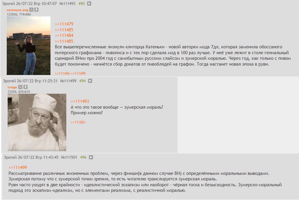 >>1138414 Еще более странная херня. С одной стороны - куча откровенно халтурной дряни. НОООУ-сцена? Серьезно, блядь? Прямиком с ебучего конвеера? Зоошиза ебучая опять-же - 2К22, довничи все еще не доперли, что этот трейт - фишечка сугубо городской психоты. Т.е. местами явно не думали дольше пяти секунд. С другой стороны, другими местами - вполне себе неплохая изобразительная часть, и на доброту какую-то похоже, и на красоту. Не пивной, конечно, в лучшие моменты, но выше среднего. В сумме - ну такое. Лучше модерн-пива, не настолько хорошо, чтобы читать с удовольствием. Слишком все же у зумерков скудный культурный багаж, чтобы хоть как-то эмулировать типы личностей, отличные от потребленческих. >>1138419 И реакцию на нее. Молчаливый_боб.жпг. Потому что рили хуле тут сказать по существу?.. >>1138418 Это ж просто с той самой методички. "Он не развивается как личность", "я любила другого человека" и все вот это вот. "100 и 1 способ слиться, сохранив щщи". В Химках торгуют такими, рядом с деревянными членами.