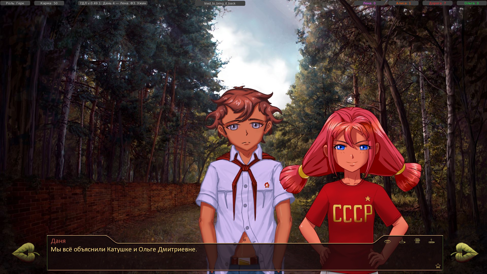 В дневном ивенте с Женей по-хорошему надо ставить разные флаги на разные исходы ивента, а не общее alt_day5_me_neu_nwsppr = True Потому что идя по ветке ответов мы с ней ссоримся и вместо похода на склад она нас выгоняет. А потом если сбежать с костра на "обычный" вечер с картой, то в ивенте с библиотекой Локи вспоминает, что они с ней книги на склад относили.