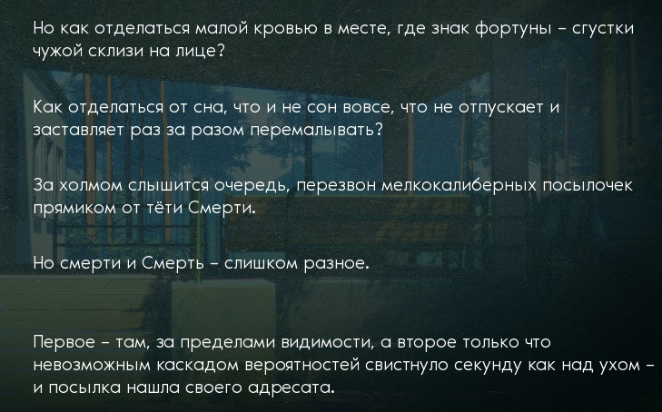Всё это в прошлом — сейчас я лежу на горячем сталепластике капота, бессильно пытаясь сделать вдох." "Понимаю, что между бампером и столбом места действительно маловато для человеческого тела, значит, всё куда грустнее, чем казалось." sl "Почему так неправильно всё, Сёмушка?" "Самое глупое, что можно было сказать, угасая."