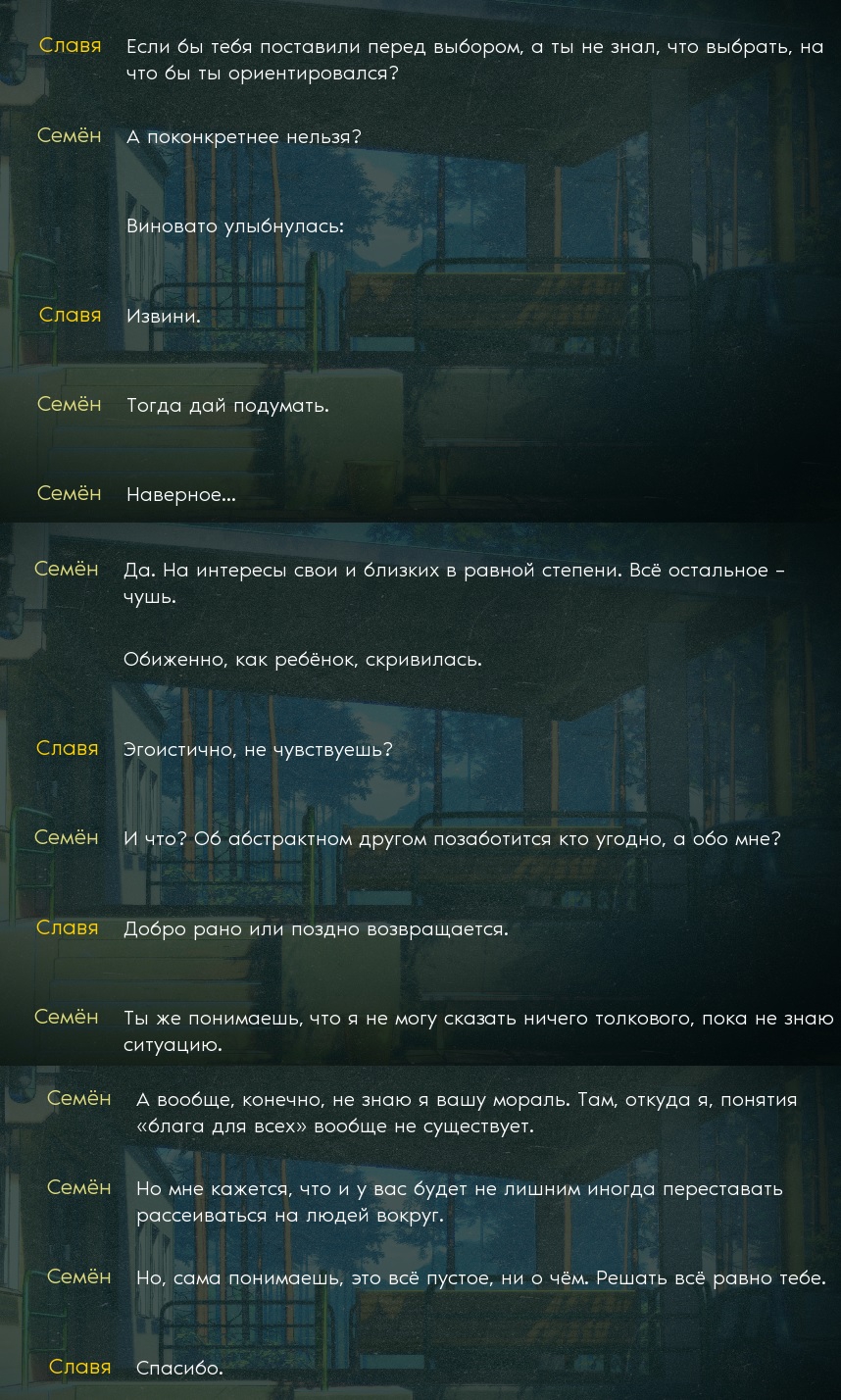 Сап люди, после перерыва решил перечитать 7дл, начал как обычно, со слави, любимая девочка лета. И наткнулся на вот такой диалог с Ольгой, где она говорит "... Как раз, что все изменения по тебе и ударили, ведь именно ты... Впрочем, неважно". Такой фразы не помню, либо забыл, что она имела ввиду? Читаю не первый рут, открыты все пазлы кроме ОД и Ульяны, т.к. Не интересно их читать. В сюжете немного шарю, но не понимаю, к чему она оговорилась? Это она вспомнила других переселенцев или самого мажора?