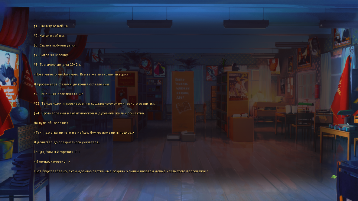 Раздел «Одиночка» переименован в «Семён» Рут Ульяна-Огоньки вернулся в состав рута Ульяна-7дл. Фактически игровой процесс при этом не изменился В ачивлисте достижения в разделе «Прочие» теперь изначально скрытые (до момента их получения) Добавлены спрайты Семёна/Арсения к некоторым разделам/концовкам Исправлены ошибки в описании и требованиях для выхода на концовки