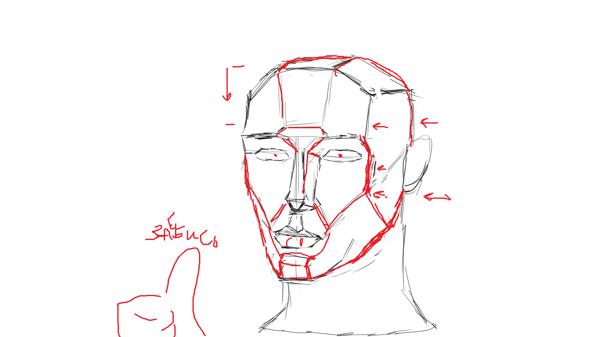 >>1147792 >>1147791 Вот так уот Сперва делаем двухмерный силуэт башки, тут не надо мыслить в трёх плоскостях. Потом начинаем резко мыслить в трёх плоскостях и добавляем этому силуету граней в соответствии с гранями 3д обрубовки. Далее стираем лишнее и опача, готово! Через какое-то время практики вы запомните эти грани и ваще будете ебашить головы без задней мысли.
