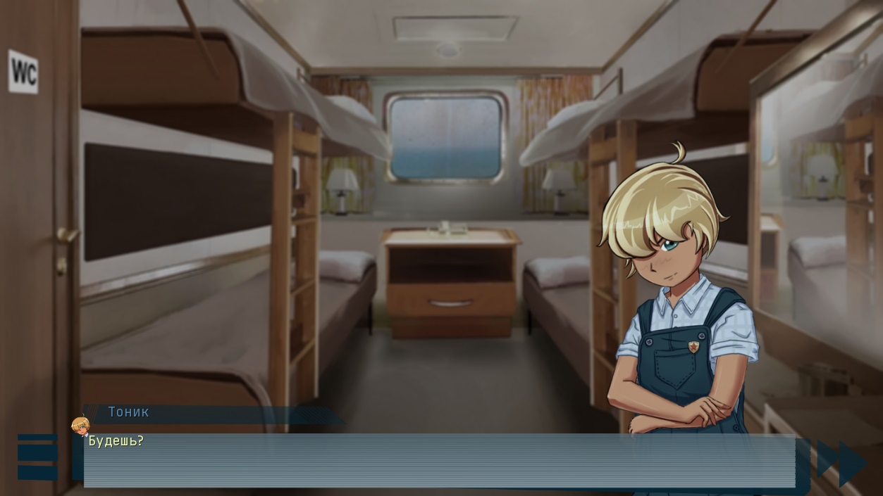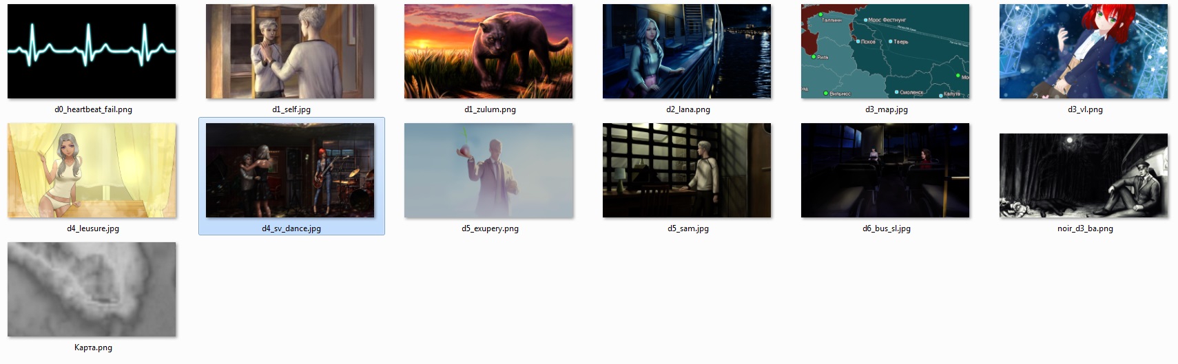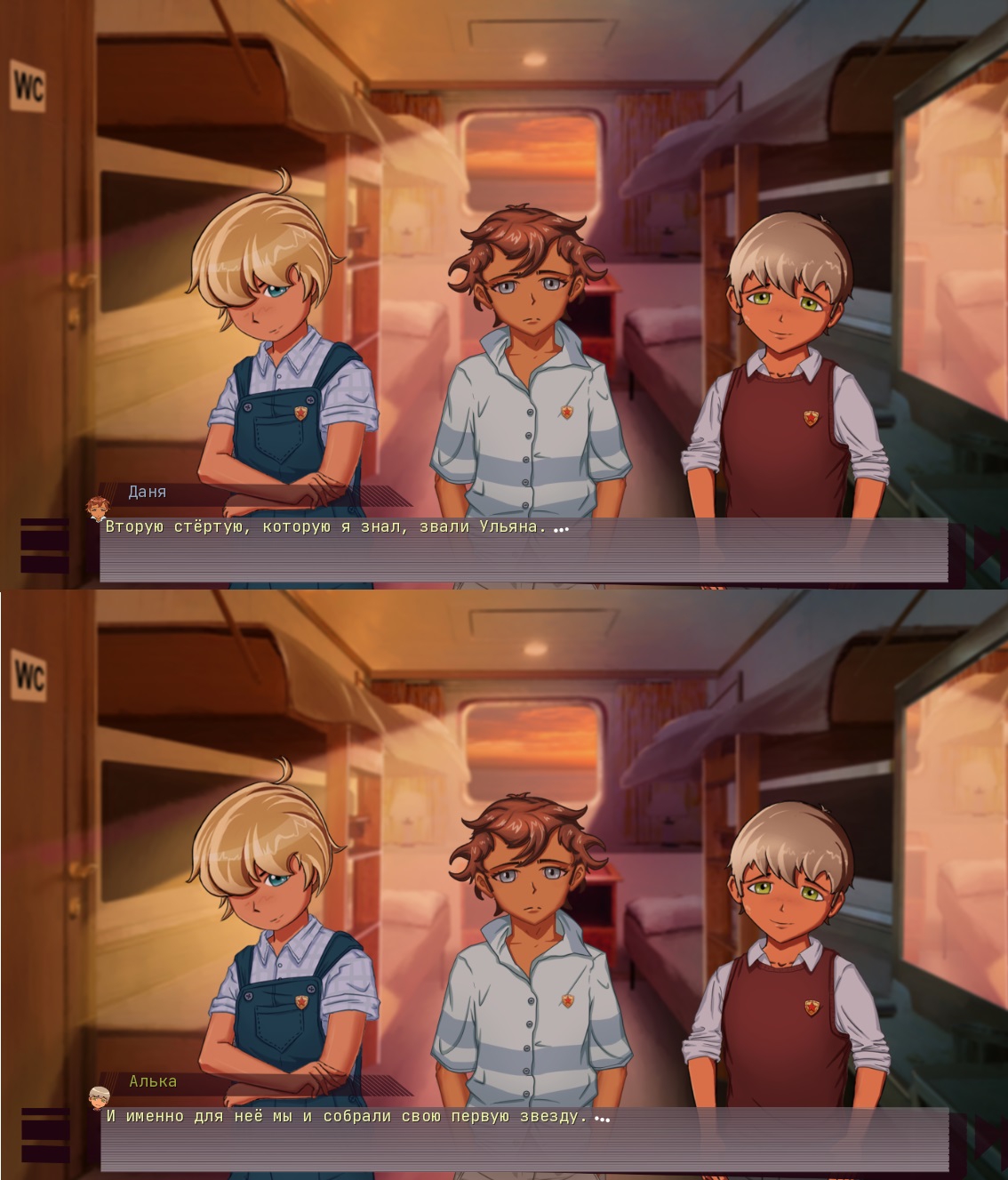 Что получается, отвечу я, пожалуй. В летосфере как нельзя удачно подвернулся подходящая графика: набор из фонов неразрушенного старого лагеря. Снаружи и внутри, с несколькими кабинетами (медсестры и вожатой), столовая, библиотека и спальня. Все эти фоны в нескольких вариантах в зависимости от времени суток. Всё это и прочее, по мелочи и крупнее, есть в летосфере и может свободно использоваться другими.