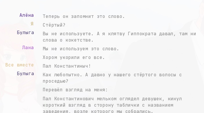 Я прошел полностью рут Ульяны, ну еще туда-сюда, но это лишь потому что гг почти не рассматривает Ульяну как романтический интерес. Ну что-то там его малость перекосило ближе к концовке, но быстро опомнился. Сейчас решил Алису пройти ну это пиздец же, а где... ну та часть где весело? Они там плачут друг дружку, в любви признаются, ебальники зареванные моют в умывальнике. Это типа и есть datfeel? Ok.