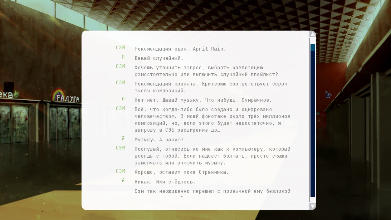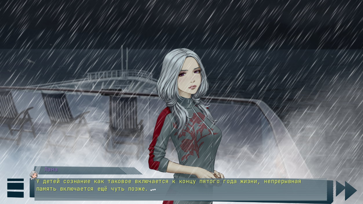>>1155529 >1. Лана(Синий провал): полностью готовый рут с четырьмя концовками. 1989 год, Нулевой мир (тот самый, где происходят основные события 7дл). Главный герой оказывается на месте мальчика с одной неприятной странностью — он почти бессмертен, так как организм откатывает все изменения, полученные за сутки. То есть, его не берут болячки, раны и... взросление. Так что за ним приглядывает одна симпатичная девушка с грустным взглядом. Удачно или нет — узнаете в руте Ланы! >2. Намики(Стук колёс): полностью готовый рут с четырьмя концовками. 2080 год, мир Техсингулярности, всем заправляют машины и искусственный интеллект. Здесь уже не главный герой выступает объектом опеки, а наоборот. В месте, куда он попадает, все, кому нужно, прекрасно осведомлены и о нём, и о его способностях, так что подбирают работёнку как раз ему по плечу — нужно позаботиться об одной девице из-за границы. А как он с этим справится — читайте в руте Намики! >3. Стася(Шелест крыльев): первые пара дней истории девочки с суперспособностями, которые ей ну вот совсем не нужны. События рута развиваются на протяжении двенадцати лет, с 1988 по 2000 год и касаются больше главного героя, сама же Стася(здесь Сташия) появляется ближе к середине сюжета. Зачем главный герой нужен Стасе, и зачем она просит его стать душеприказчиком — узнаете уже совсем скоро! А пока затравка для интриги. >3. Ремастер Нуара: старый знакомый сюжет с чуть обновлённой графикой. 1991 год, Нулевой мир. В посёлок Радченко с расследованием прибывает этакий частный детектив советского посолу — "порученец", или специалист по особым поручениям. Вот только заказчик уже погиб, да и в Радченко творится какая-то чертовщина...