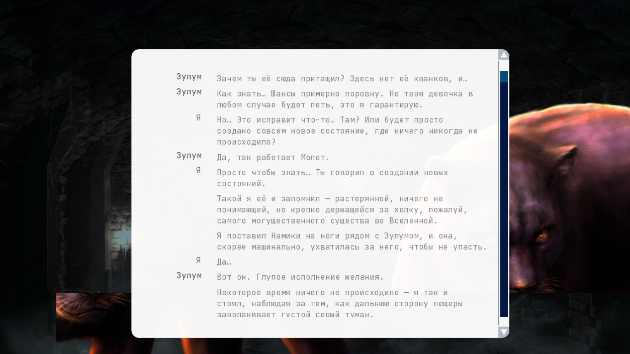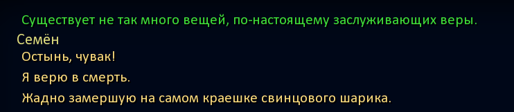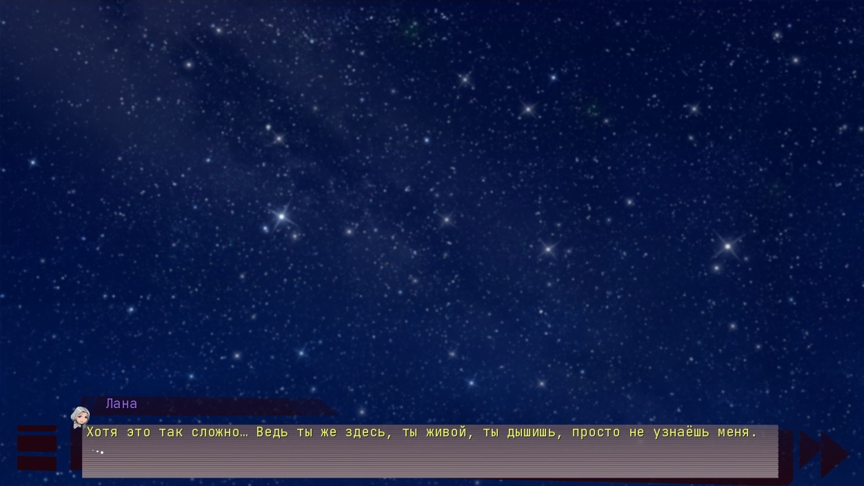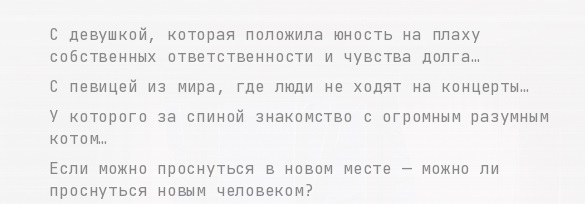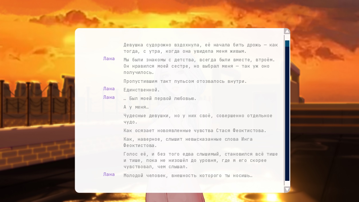 "Ты обещала меня встретить, помнишь?" "Обещала поймать меня из воздуха и не позволить мне исчезнуть." "Я ценю с твоих уст эту сладкую ложь. Непонятно так, жутко и странно — но ты ею как шрамами бережно шьёшь инфантильности рваные раны." "И стоило ли вспоминать?" "Стоило ли позволять исчезнуть одному из нас?" "За право однажды встретить тебя улыбкой узнавания." "Ибо нас всегда было двое. И одного безответно любила ты, а другой был влюблён в тебя до беспамятства." "И мы были разными людьми, из разных эпох, с разной памятью." "Так по какому праву мы судим, кому жить, а кому исчезнуть?" with fade2 "По праву памяти?" "Моя память содержит четверть века жизни кого-то, кем мог бы стать твой ненаглядный Сёмыч." "Или не мог бы — тут уж как карта ляжет."