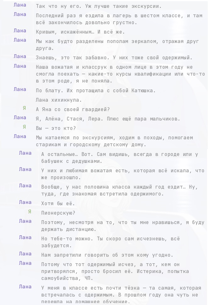 Момент когда он влюбился не описан, но это было в первой смене, ещё до выхода на Дорогу. Возможно амбалам стоит раскрыть эту тему, когда они начнут писать последний рут, у них по Мажору большие планы, стоит уделить и этому внимание. >Когда читал рут, у меня сложилось впечатление что Ольга вполне осознает, что ей нужен Мажор, говорит "мы победили". Тут надо понять, что для Ольги как педагога такой исход и есть лучший, Мажор вылечился, с плеч Виолы и Ольги упал груз проблемного пионера. Да, и что она может сказать Мажору - "да, мне жаль что ты выжил и вылечился от своей болезни, я бы предпочла чтобы ты умер, а гость бы был тут со мной?" в лицо сразу после того как для него всё закончилось наилучшим образом? >Алсо, кошкодевка получается совсем мелкую Алису из Нулевого тупо убила, у нее не было и шанса против детдомовской. Вообще ее роль максимально странная получается, то она тягает ПСРов в нулевое, но при этом отпугивает любопытных от Дороги, и проводник и страж в одном флаконе. А огоньки получается - пидарасы, раз заманивают лохов на Дорогу. Огоньки это инструмент для правиильного выхода на Дорогу. Успешные выходы на Дорогу показаны в огоньковой ветке Ульяны, где всё сделано по правилам. Юля отпугивает тех, у кого изначально невозможная цель(Лена из ФЗ). Что же касается ПСРства, то амбалы в редактированной версии "Тьмы и Неона" у Слави попытались объяснить, почему Юля вообще возится с мёртвыми людьми. Довольно костыльно конечно получилось, с другой стороны пивописово объяснение с септимками точно не лучше(и оно не объясняет почему ПСРы вне ГЛД существуют)