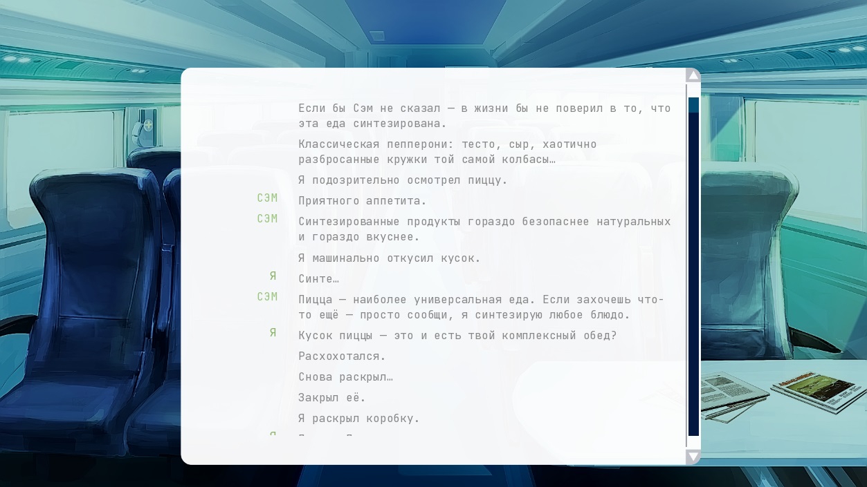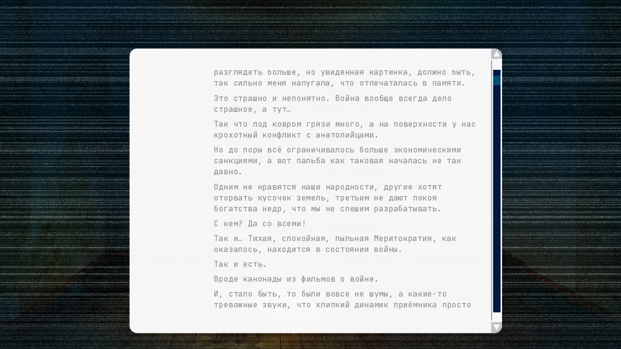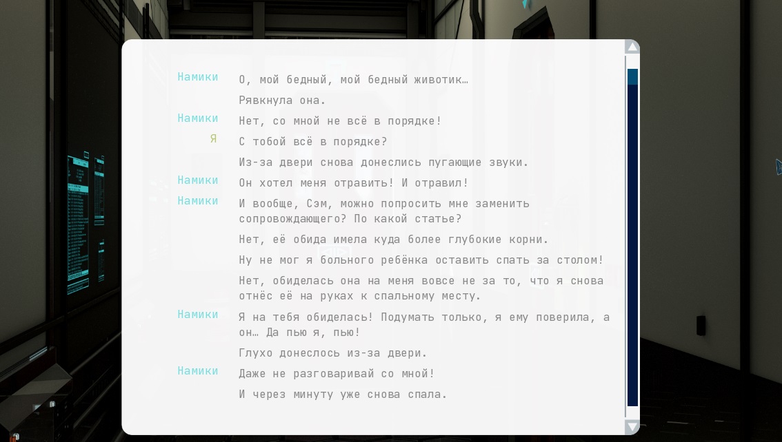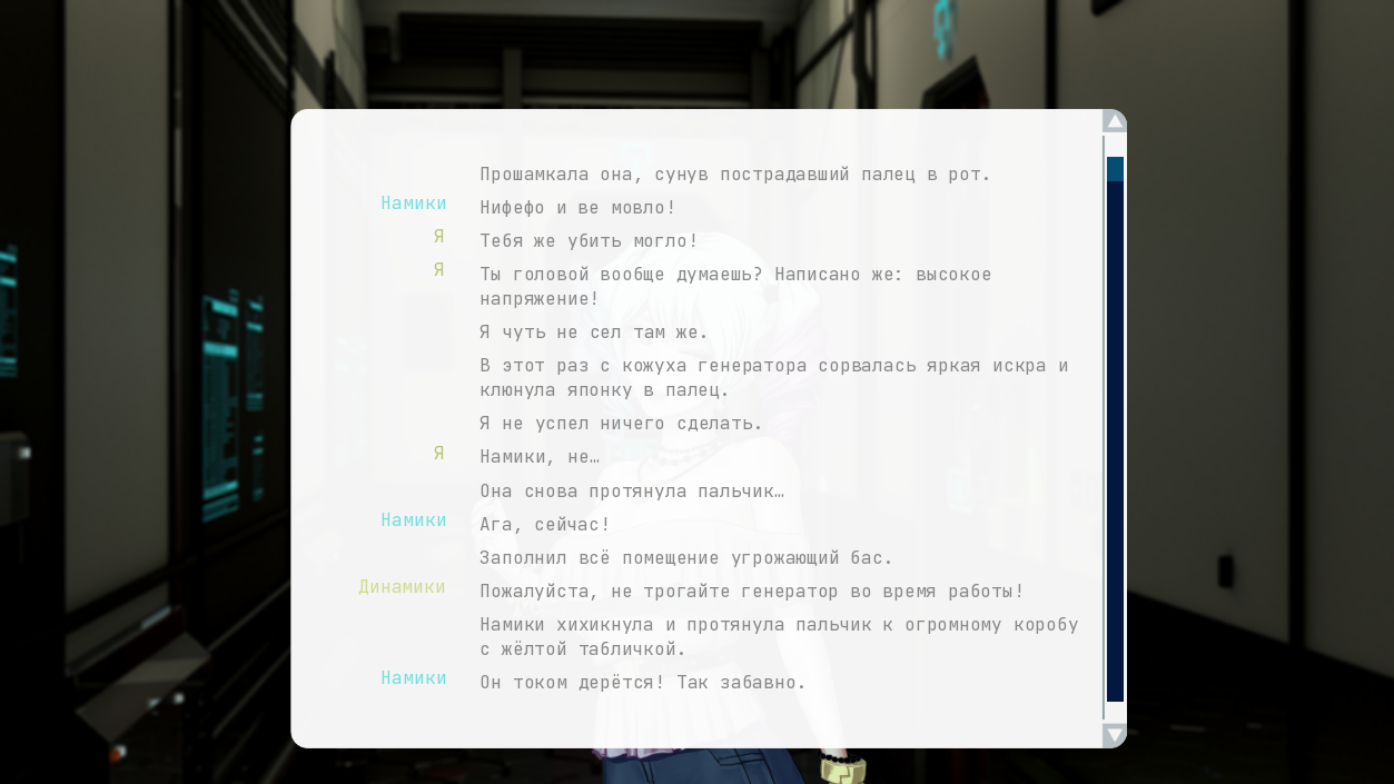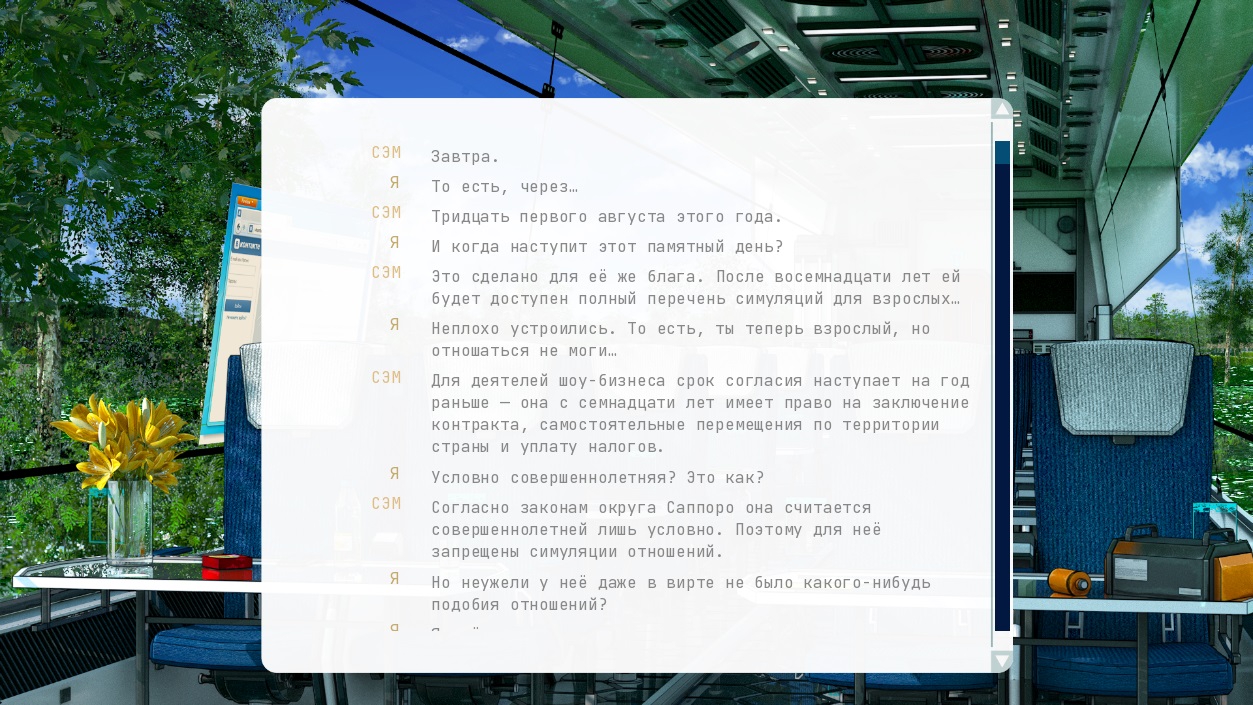 lr "Самым главным и самым паскудным изобретением человечества были микро-ядерные заряды." me "По причине?" lr "Общественное мнение и финансовые санкции. Если ты с кем-то воюешь — это твоё личное дело." lr "Но загаживать общественную планету не смей. Америка однажды жахнула по Тверской области — заработала триллион штрафа." me "Стоп. По той области, которая ни с того, ни с сего увеличилась в десять раз?" lr "Как я понимаю, там сработало свёрнутое пространство, которое среагировало на бомбу." lr "Икарьев Геннадий был жертвой войны — на момент. когда он пошёл во второй класс в своём родном Моос Фестнунг, какие-то умы решили, что пора бы уже на Федерацию напасть." lr "Заодно и опробовали те самые МЯЗы." lr "Что забавно, создатель прототипа американского МЯЗа был сам выходцем из России, из-за чего в обе стороны через границу летали примерно одни и те же заряды." lr "Их преимущество в том, что обладая всеми достоинствами самой обыкновенной ядерной бомбы, они были лишены её недостатков вроде радиационного загрязнения." lr "На месте взрыва оставалось небольшое радиоактивное пятно с лёгкими изотопами, которые довольно быстро распадались." me "Быстро?" lr "Две недели." lr "Собственно, эти две недели и вошли в историю как Третья Мировая Война — все против всех, у всех есть МЯЗ, но ни у кого нет противодействия." lr "Война загоризонтной артиллерии, как её ещё называли." me "И всё, за две недели расстреляли боезапас и успокоились?" lr "Если бы. Просто через две недели у природы лопнуло терпение, и она ударила в ответ — сначала повышением среднегодовой температуры сразу на семь градусов, затем горящими лесами…" lr "Разумеется, это привело к таянию полярных шапок и повышению среднего уровня океана." lr "А ты не в курсе? Спроси у своей Намики, что это за такая Земля Горьких Слёз к северу от её родного Саппоро." lr "А, ты не можешь, точно. Ахха. А почему?" lr "Разве тебе не велели за ней приглядывать? Почему тогда ты здесь, а она неизвестно где?" me "Там… Долгая история. С котиками, кормушками… Электричеством." show lr laugh casualjacket with diss lr "Ах, котик." "Лера подняла голову к небу и долго, обстоятельно хохотала — почти как человек." lr "Какой же ты… Идиотик. Ты же сам хочешь, чтобы тебя обманывали, да?" lr "Электричество! Ой, умора…" "Меня чужой смех не пугал, но поведение робо-гида, то есть организма насквозь синтетического…" me "Скажи… А тебя никогда не звали Розой?" "Поинтересовался я." show lr normal casualjacket with diss lr "Так, это к делу не относится. Продолжим нашу экскурсию." lr "Так вот, у человечества не было бы и шанса, если бы к моменту начала контрудара природы оно не успело создать свой первый машинный разум." lr "Контрудар природы в истории остался как четвёртая мировая, а вот с машинным разумом всё было сложнее." me "Оцифровка." "Догадался я." me "Технологии тогда вряд ли бы смогли что-то путное сделать." lr "Правильно. Весь «маленький принц» превратился в прототипы будущих Сэмов — они и создали первый полностью синтетический разум со способностью к самовоспроизведению." lr "Тот создал второй, второй создал третий… Помнишь, как в Библии: Иаков родил Исава…" lr "Седьмое поколение Сэмов уже было достаточно гибким и мощным для того, чтобы представить человечеству первый прогноз." lr "На тушение лесов." lr "Политики мямлили что-то про экономическую нецелесообразность, но в Бразилии подняли на вилы правительство, после чего все прочие призадум