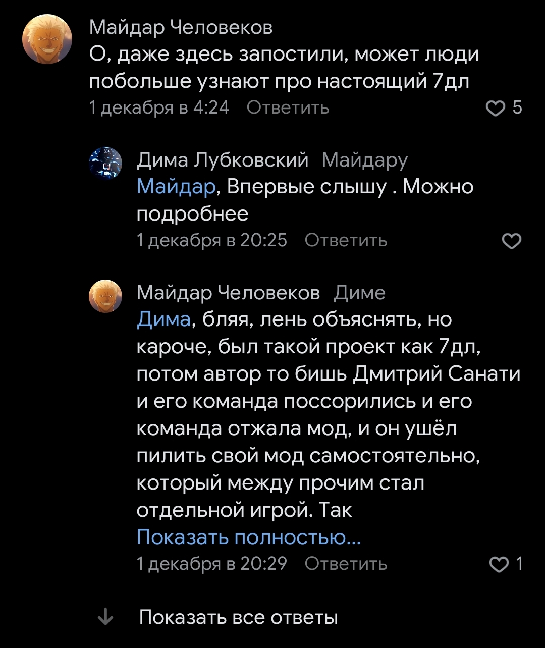 Вчера, в ходе беседы в дискорд-канале, выяснилось, что группа из двух энтузиастов решили перевести 7дл на ангельский. С их слов: мы два рандомных алкаша, которые начали читать 7дл месяц назад и настолько охуели с рута Лены-ФЗ, что решили перевести весь мод. Перевод машинный, но доведённый до ума ручками. Например, англоязычные положительно отозвались о руте Ольги.