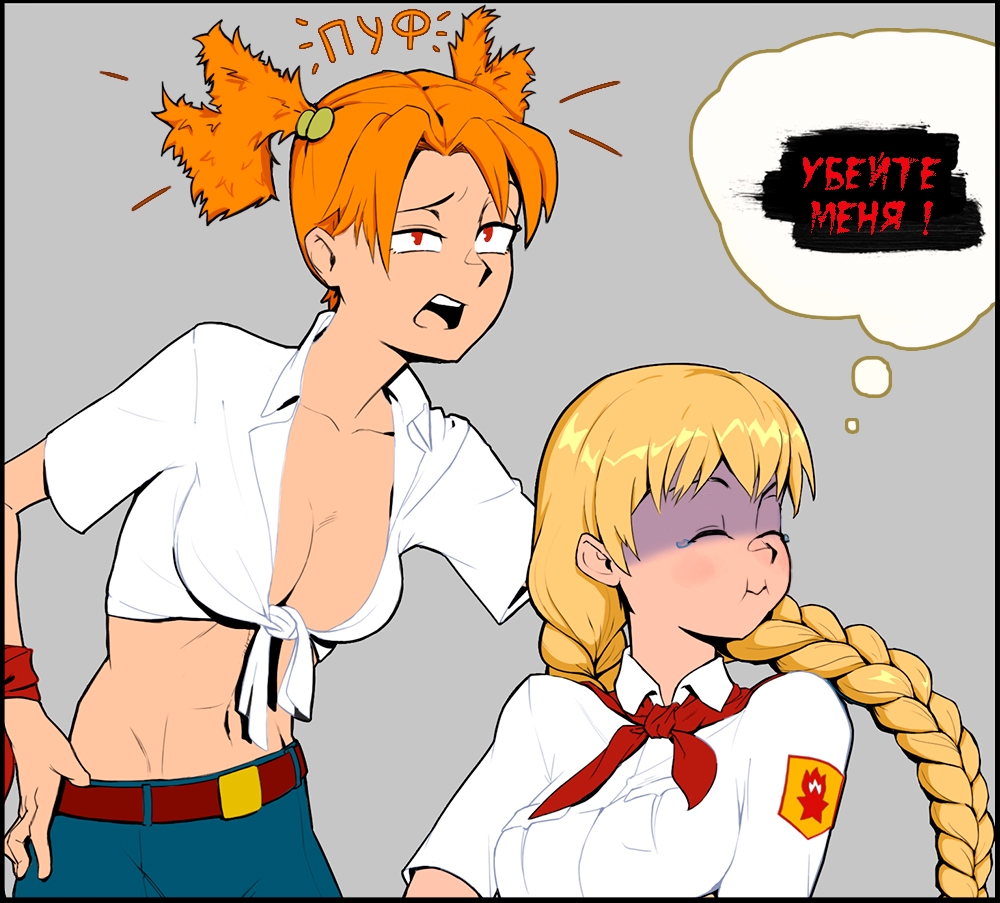 >>1160843 Во, чётка. Только нафиг сиги. Только сиськи рядом с недорисованной рукой чутка побольше сделать, а то сплюснутая сильно. >Тогда у неё либо ножки-спички торчат, либо она выглядит как перекачанная бой-баба Мы за спорт! >Короче этот образ плохо вяжется с пионерской юбкой и носочками Когда не знаешь какую одежду нарисовать, значит одежду рисовать не надо