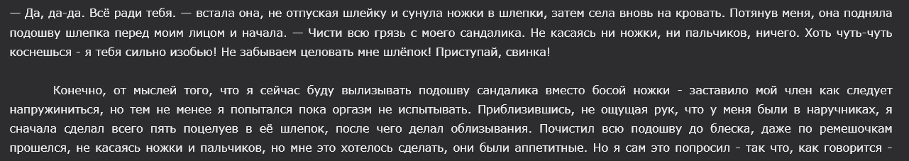 >>1165233 "В момент, когда Буян пронесся рядом со мной, я мельком увидел на его гиганских причиндалах следы помады…" Напомнило, как девушка для коня покупала вазелин. Чтобы его шерсть красиво блестела. Надеюсь, здесь тоже есть простое, но неожиданное объяснение. " — У коня весь низ исцелован." Все еще надеюсь на лучшее. "А самый большой брат постоянно следит за тобой." А рабство это свобода, ага. Концовка главы весьма хороша и достойно повествует о нелегких буднях отечественной объезчицы мустангов. Надеюсь, что в лагере наша рабочая парочка теперь устроит Славе несколько очень трудных ночей. Чтобы проверить, насколько сильны руки дружбы и как глубоко они могут зайти.
