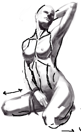 Почти как половины двух разных рисунков, сверху более "реалистично", снизу - идеализованные аниме-бедра. Слишком кругло? большие ягодичные мышцы перестали читаться, ямки или прямой участок между gluteus maximus и gluteus medius пропали.