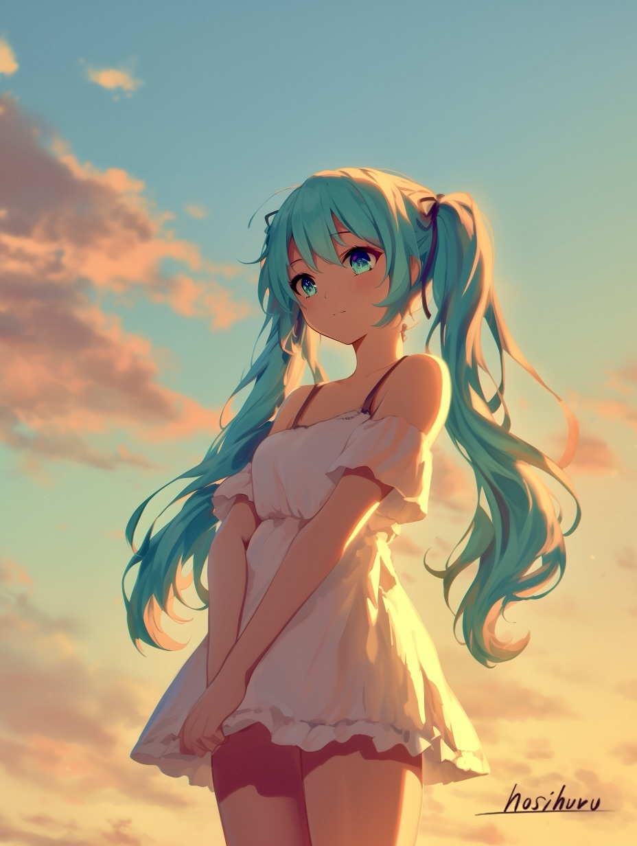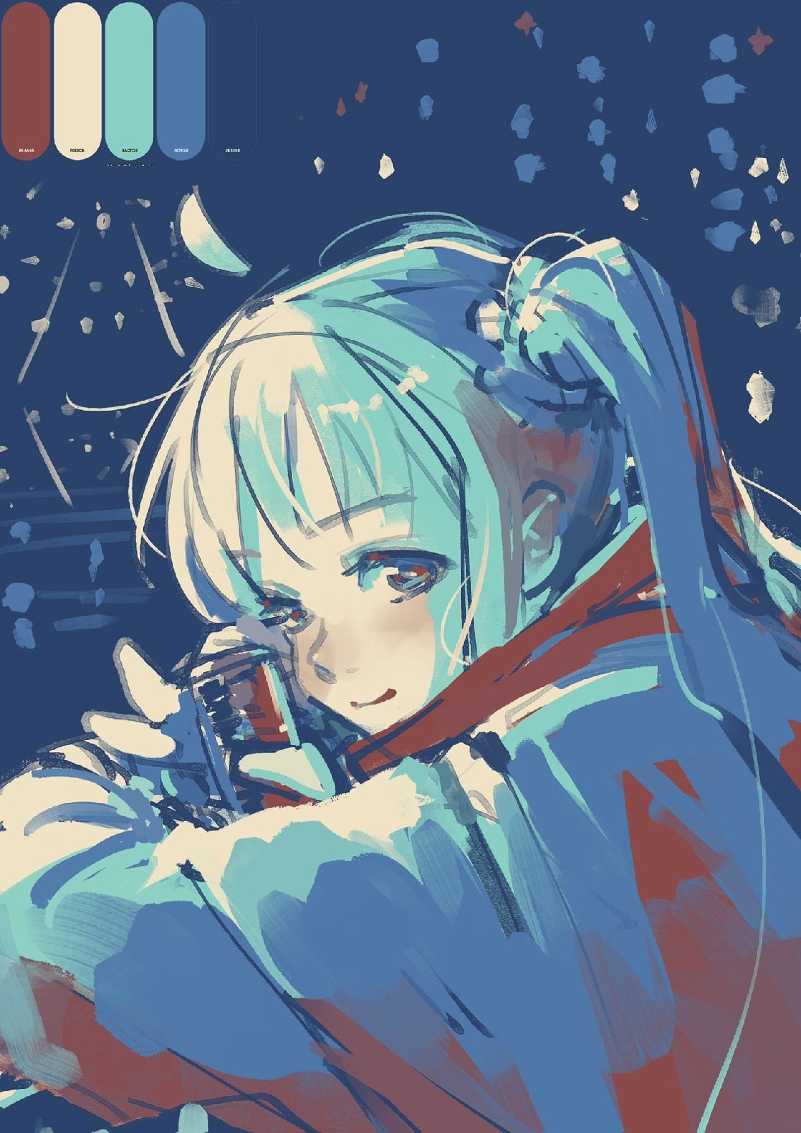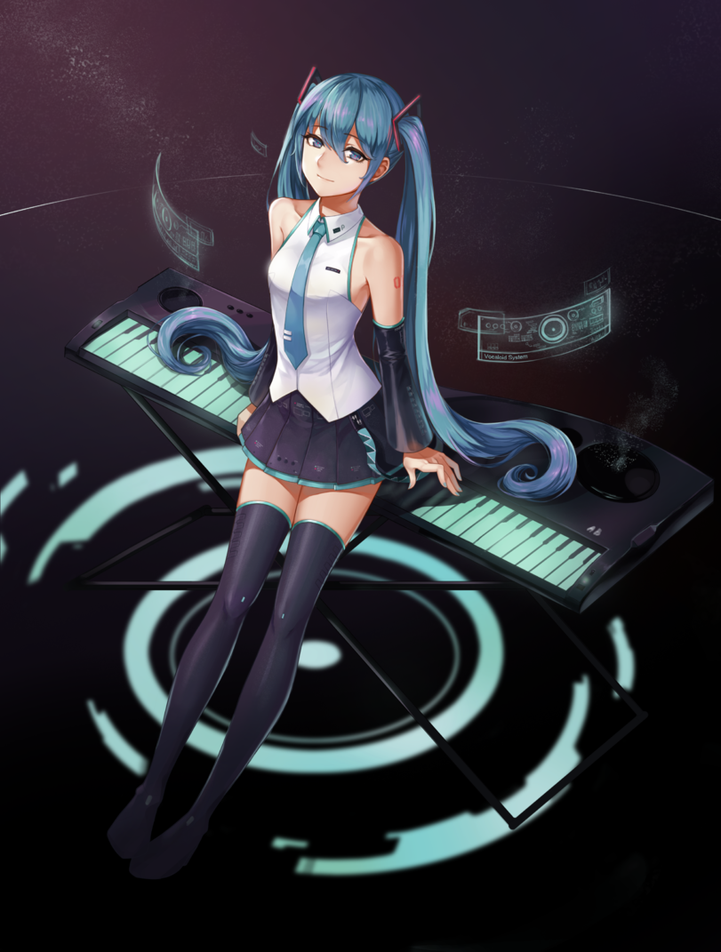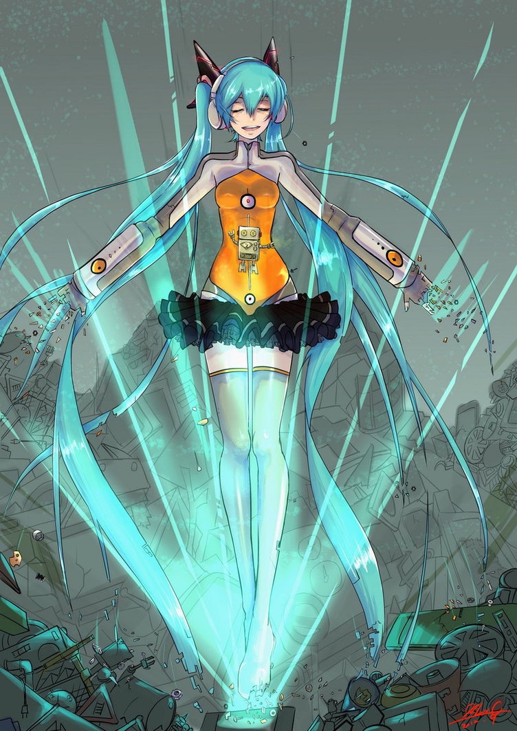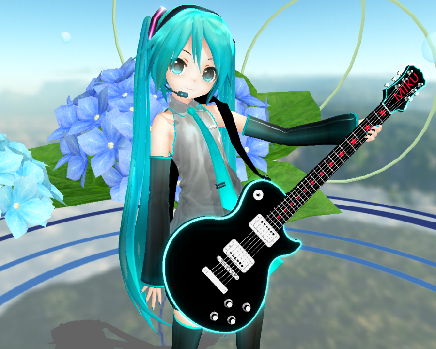 Что мы знаем о Мику? 1. Это вокалоид, и значит она поёт. 2. Внешность - это мятно-голубо-зеленая гамма и волосы убранные в сигнатурные хвостики. 3. Играет на гитаре (возможно и других музыкальных инструментах.