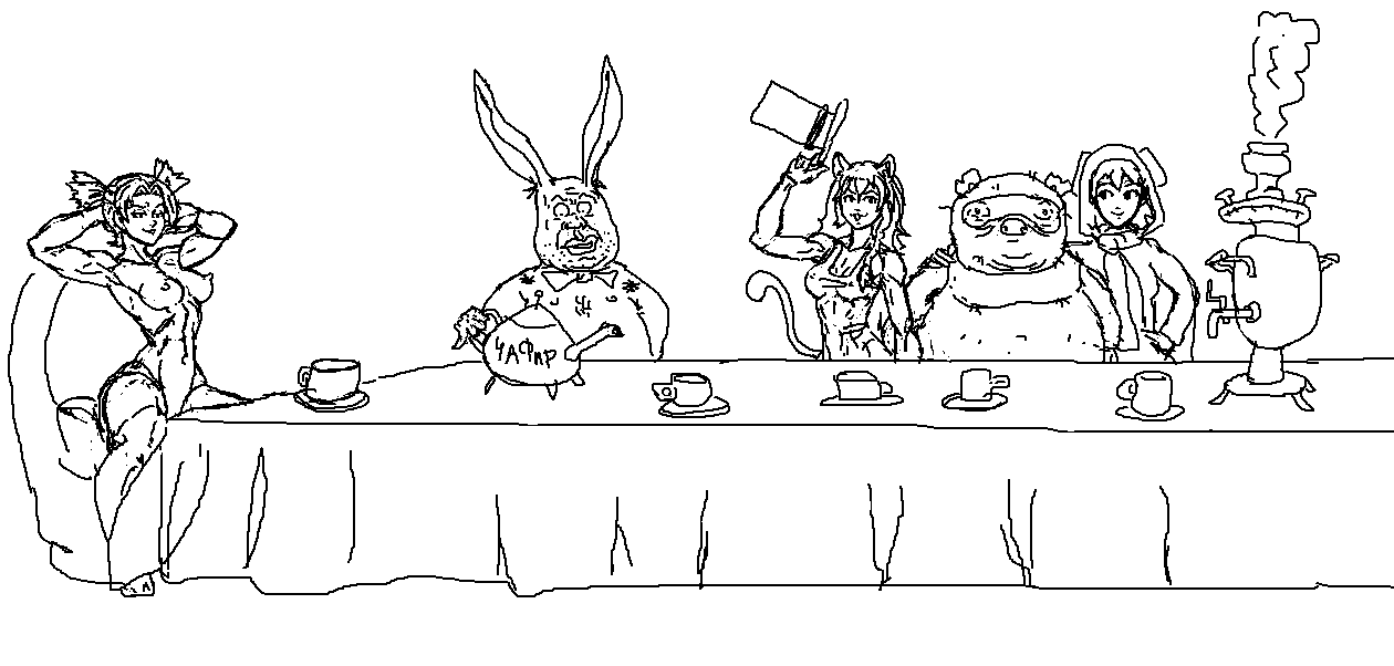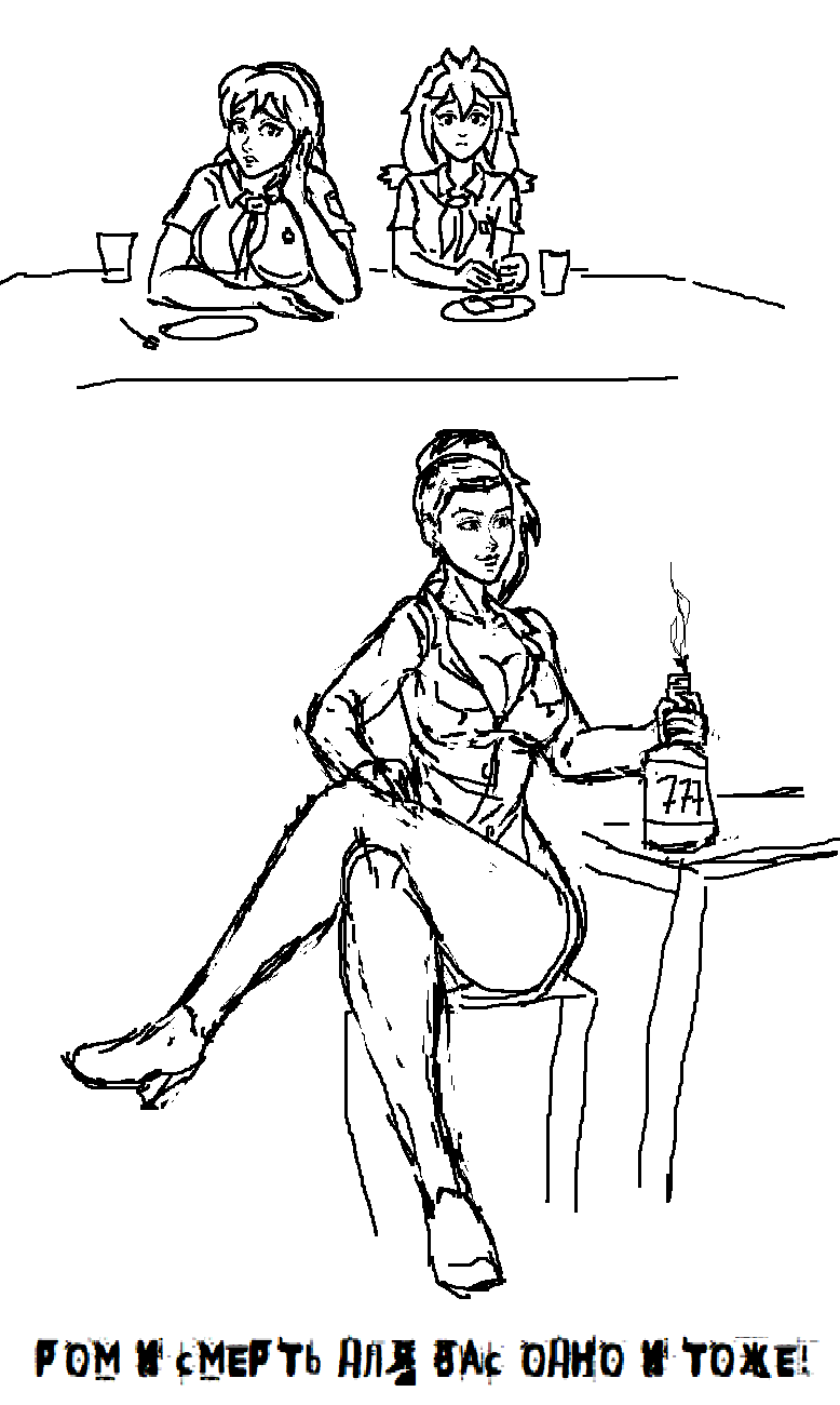 >>1214059 Столовая. Славя и Ульяна за столом пьют какао, недоуменно смотря на соседний столик. Следующий кадр, за соседним столиком сидит Виола, наслаждается стаканом портвейна "777"