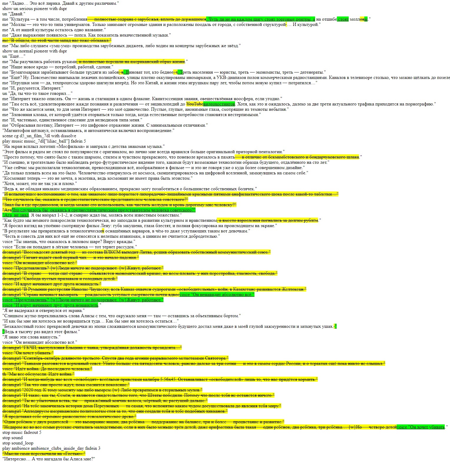 >эпизоды идут один за другим. Очень тяжело читать P.S. Прошел уже четырёх девчонок, все руты 1 и 2 порядков. И ни одного целого, без багов, нет. Честно говоря, сочувствую тем, кто впервые читает 7ДЛ с этой версии, иногда даже не понять, что происходит, если до этого не играл.