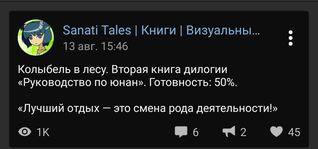 >>1210883 Был ещё такой кек - после Мику-7дл по плану шла Ульяна. Весь 2017 год Димка потихоньку подкручивал проценты готовности, а потом оказалось, что 90% готовности Ульяны это готовность фанфика, который в последствии станет лишь одной из веток рута. То есть он тогда на полном серьёзе 20-25% текста рута выдавал за готовый закодированный полностью рут
