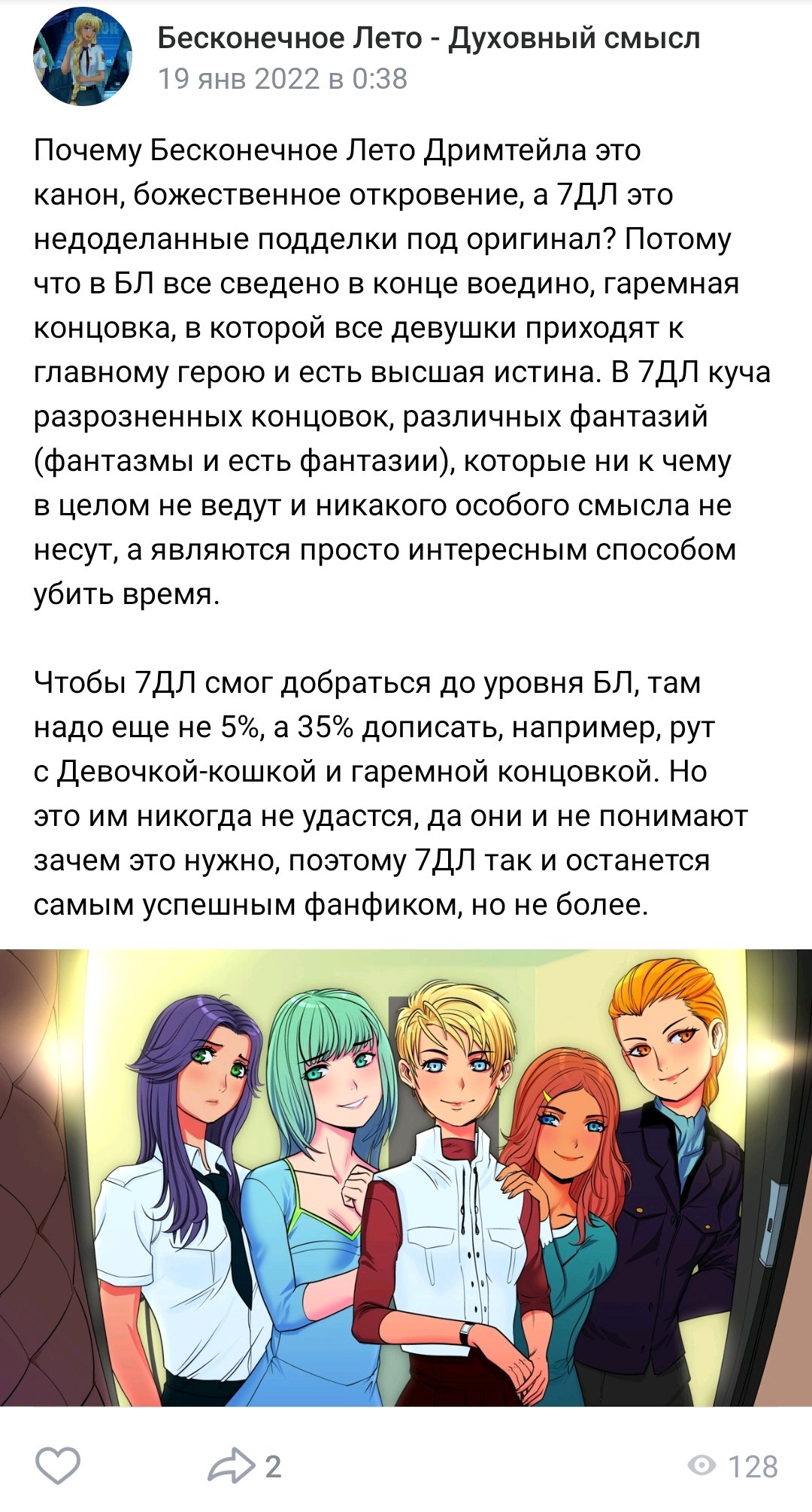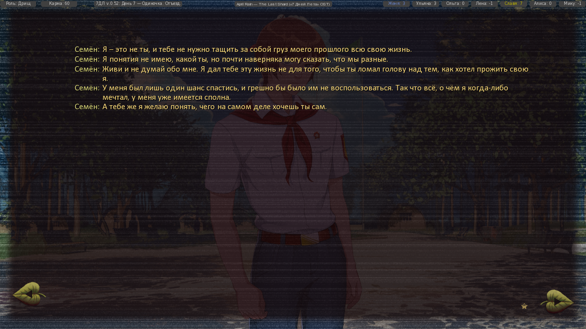 Перепрошел я значит рут Алисы, единственный, который играл в 16 году. И я разочарован. 7 дней лета - это такая же графомания, как и оригинальный убогий сценарий ритана. Персонажи буквально говорят об одном и том же изо дня в день, Алиса стесняется своей феминности и ревнует, Семён ее укрощает. Нет какого-то ощущения, что я тусуюсь с человеком, который мне нравится, хотя это именно то, за чем я пришел в игру. Персонажи постоянно выходят из образа. Вчерашние подростки не должны говорить языком сложносочинённых предложений и метафор, кучу литературных отсылок я могу ожидать от кого-то типа Лены, но никак не от пацанки-бунтарки. Были какие-то моменты, когда я улыбался в экран и думал: " да, хорошо зделоли", но это было буквально пару раз. Очень грустно, очень жаль, я верулся чтобы навестить что-то, что мне когда-то очень нравилось, что я помнил, как образец того, как нужно писать подобные игры. Но нашел я 4/10 новелку, которую забуду через день или два. Хотя это всё ещё лучше, чем писанина Риты, то прямо откровенный шлак.