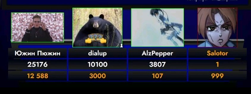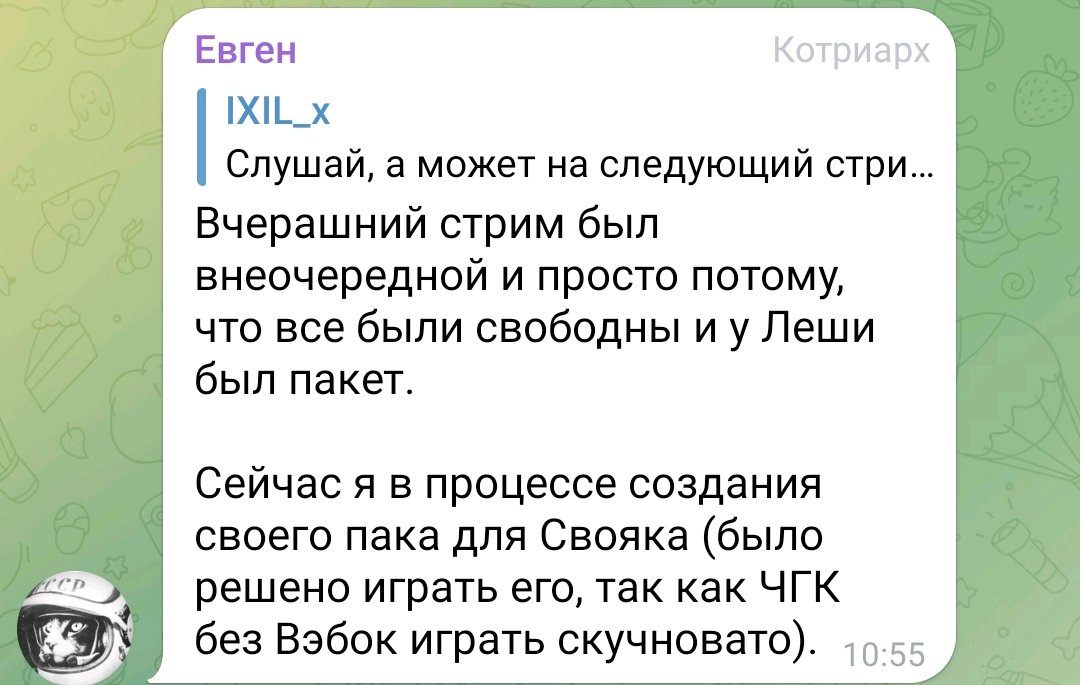 В целом формат годный, следующие стримы тоже посмотрю, если будут. Было бы неплохо ещё какой-нибудь лайтовый около треш-ЧГК увидеть в исполнении амбалов. Серьёзный ЧГК потянет только Евген, увы. В лайт-ЧГК Евгена надо ведущим, а госпожу ДиалАп капитаном команды зумеров. Гарантирую, будет весело смотреть на их затупы и обсуждения, плюс никто не сможет отмалчиваться весь стрим. Если будет ещё раз СИ, то Евгену опять же надо дать быть ведущим, потому что у остальных шансов его победить нет.