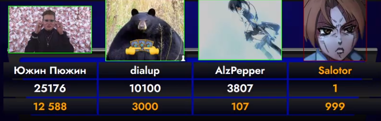 Салотор - инцел, убрал в конце категорию "Женщины" для супер-финала. Оправдывал проигрыш тем, что у него пинг и пробел не нажимался. Осилил ответы только на вопросы об аниме. На вопрос где прямым текстом сказано отвечать двумя словами написал одно. На вопрос про ёжика ответил, что в древности ежей использовали как губку(???) и не смог даже пояснить почему. Просто пиздец, главный амбало-чмоня.