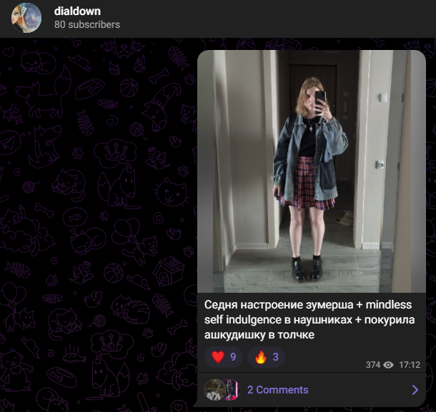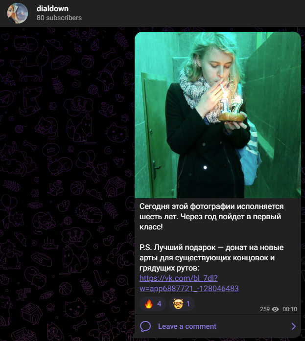 >>1221084 Не знаю про кого ты, но госпожа Диалап в контексте 7дл - это наша Катенька. Пикрил её тг. Главный сценарист и хедлайнер проекта.™