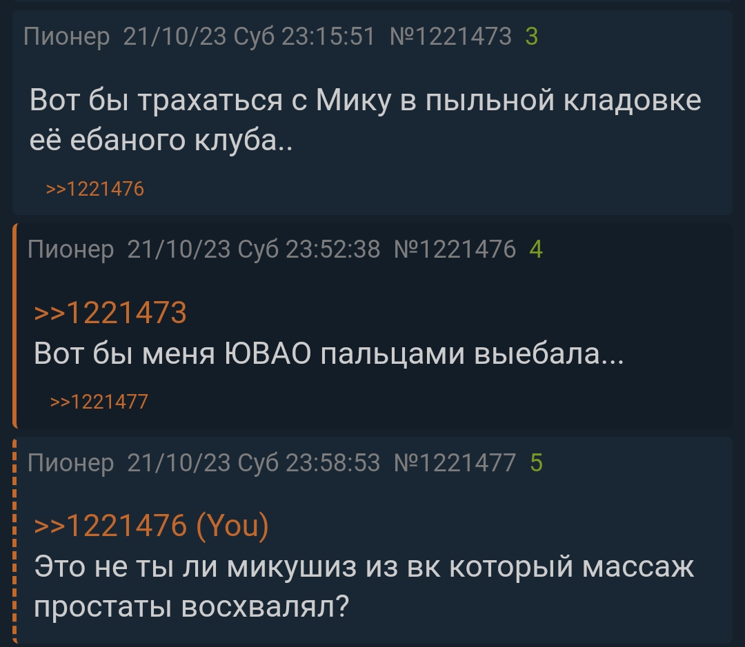 >>1221477 Нет, про Мику вообще не мой пост. Если скрины есть с восхвалением массажа есть - то доставь, пожалуйста, я не видел такого, лол. Или подскажи где искать, хочу посмеяться.