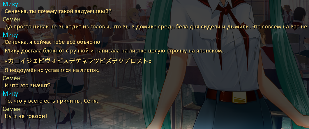 >>1221604 Ну допустим я играю, вообще не знаю про эти все разборки кто что там кого наебнул, удалил и т.д. И тут в игре мику пишет на японском, по идее я предполагаю там какая-то фраза которую семён понять не должен, но мы как игрок можем ее перевести чтобы контекст разглядеть, чувства мику лучше узнать не знаю. А там вот эта хуйня...