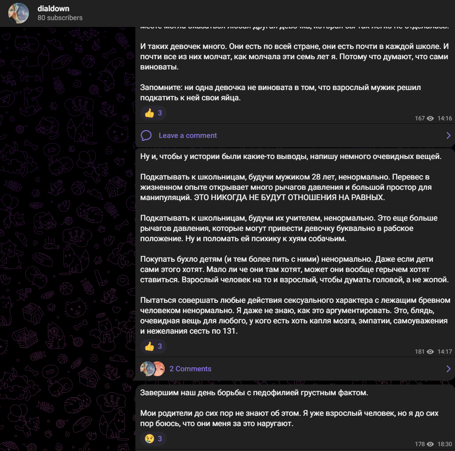 >>1222477 Бывает и хуже. В большинстве случаев сексуальное насилие исходит от семьи и ближайшего окружения, вот это реально пиздец, потому что сбежать нельзя. А в моем случае похотливый хуйлуша мало того, что самоустранился, так еще и страшно очковал, что эта история всплывет. До окончания школы любила подловить его на улке (если удавалось, обычно он при виде меня оперативно съебывал) и с ехидной улыбкой стрельнуть у него сижку. С видом "я сдам тебя, дружок-пирожок, только рыпнись" Да и в принципе я сейчас его не деаноню только потому, что пруфов не осталось